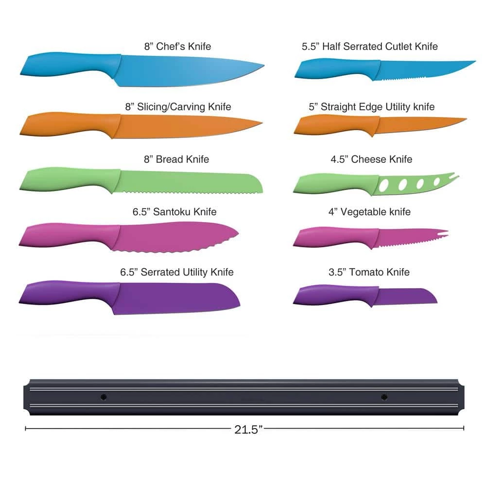 - Cutting knife set -this 10-piece colorful knife set includes an 8 in. chef’s knife, an 8 in. slicing/carving knife, a 7.5 in. bread knife, a 6.5 in. santoku, a 6.5 in. serrated utility knife, and a 5.5 in. half serrated cutlet knife
