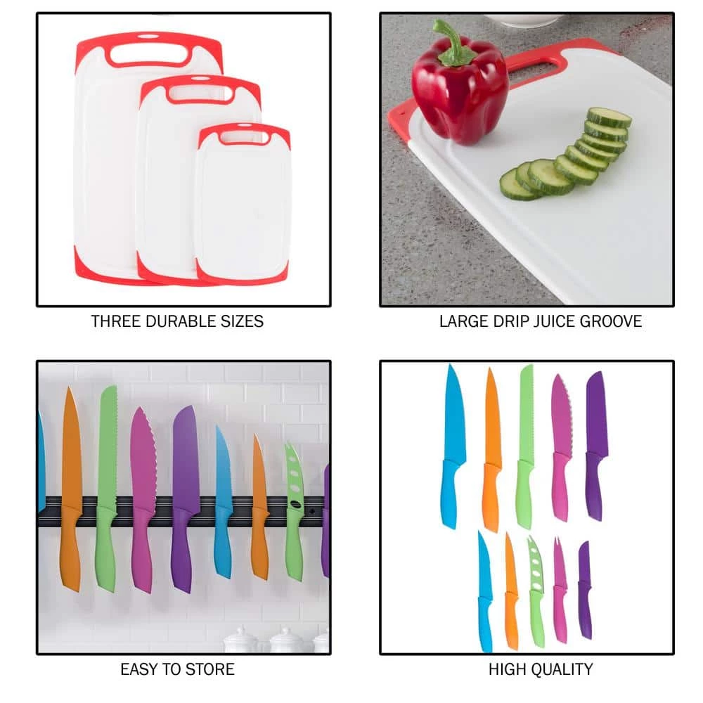 - Product details -materials: stainless-steel and bpa free plastic, dimensions: magnetic strip: l 21.5 in.; cutting boards: large: l 16 in. x w 9.5 in.; medium: l 13 in. x w 8 in.; small: l 10 in. x w 6 in. color: rainbow knife set and red cutting boards