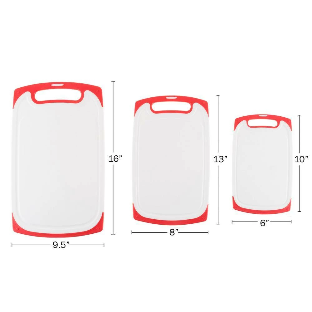 - 3-pack chopping boards -this set includes 3-sizes to ensure you always have the right board available or to reduce cross contamination, the plastic material does not warp, crack, or chip, is heat resistant to chop cooked foods, and is dishwasher safe