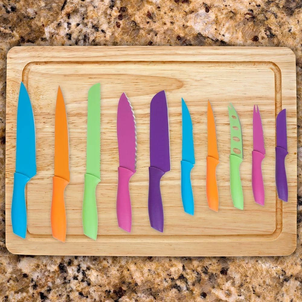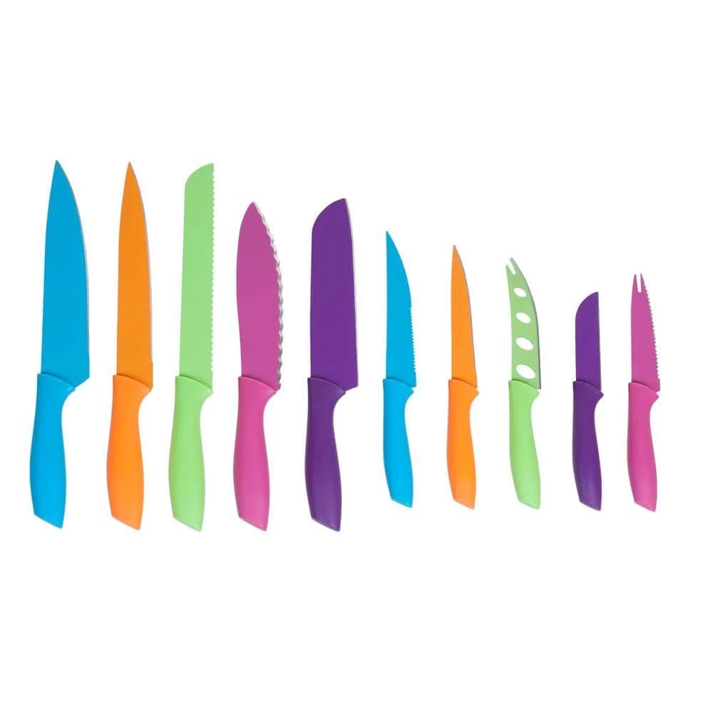 - HIGH QUALITY – This 10-pc culinary knife set is intended for long lasting use and is made with high quality stainless-steel. The food safe, stick resistant coating makes for easier cutting with vivid colors that help prevent cross contamination.