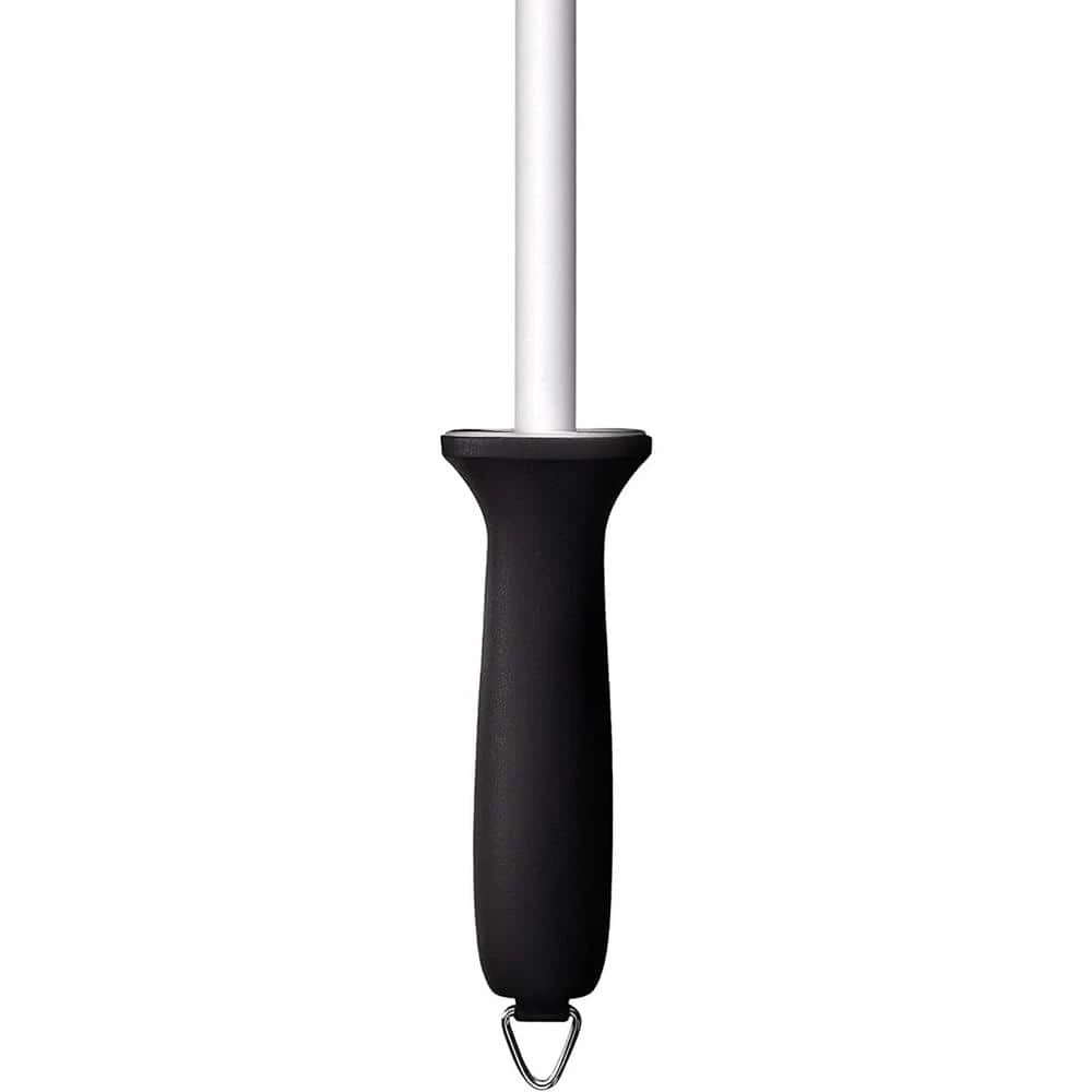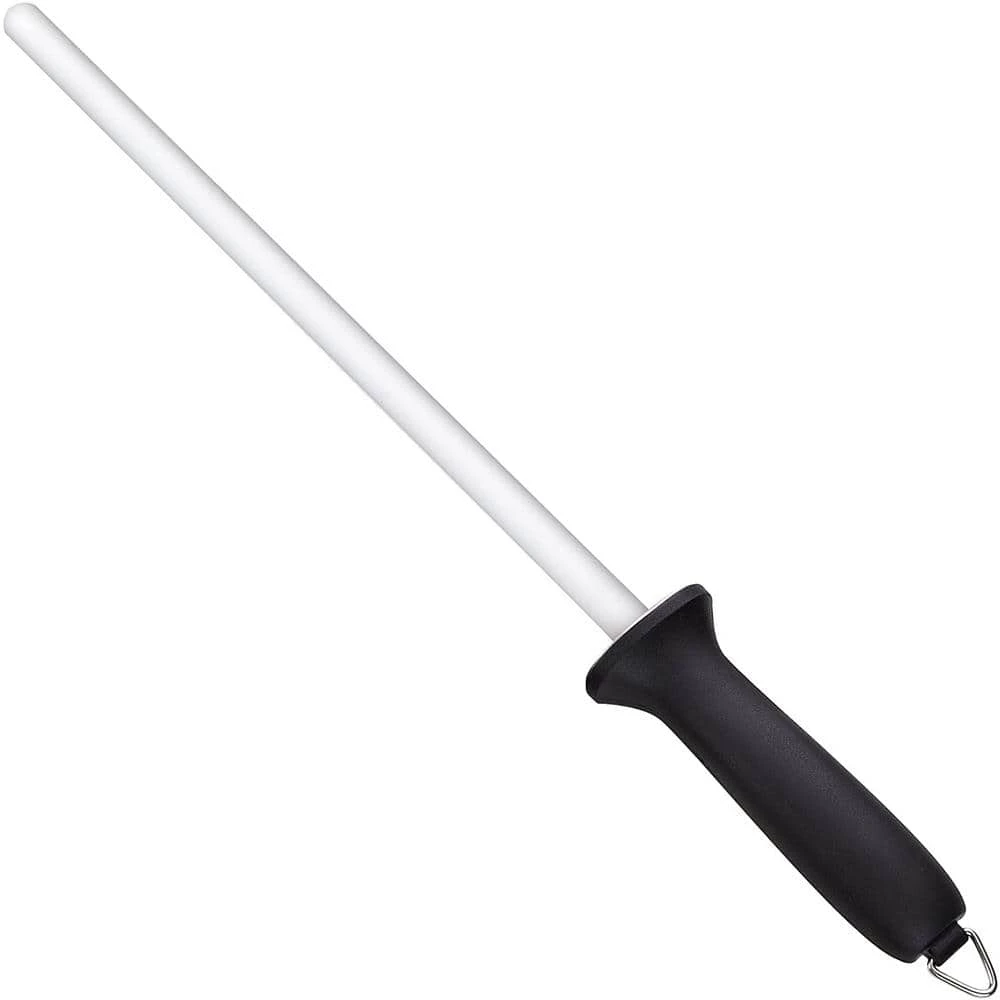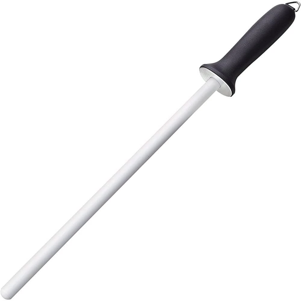 The Cooks Standard Professional Ceramic Rod Knife Sharpening Steel, 12-Inch/30cm is made of high quality ceramic alumina that is harder than regular steel and prevents rusting. Rod length measure 12-inch/30cm and 5/8 in. diameter without handle which is long enough for professional use. Ceramic material is wear resistant and light weight for long use. Handle is designed for safety and comfortable to hold with a stainless steel guard cap and ring. Ceramic is hard, but not break resistant. Please do not drop on ground or hit on hard surface. Wash and brush after use with regular kitchen detergent/abrasive cleanser and sponge.