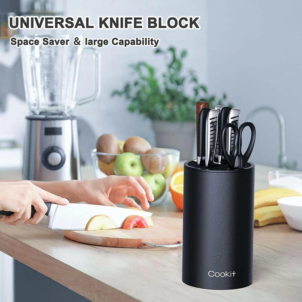 - This knife block made of premium pp material, it can hold all up to 12 knives with 8″blades plus a pair of kitchen scissors or sharpener, save your space and enjoy a huge amount of capacity in small kitchen