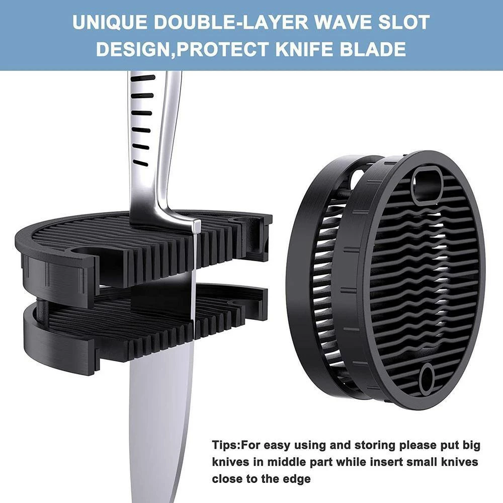 - The bottoms of the knives do not touch the surface of the round knife block, protecting the sharpness of the blades. the parallel knife groove design protects the blade from scratching and prolongs the service life of the knife