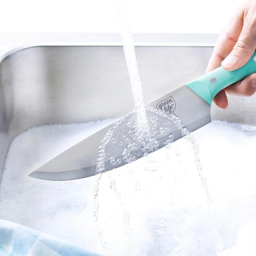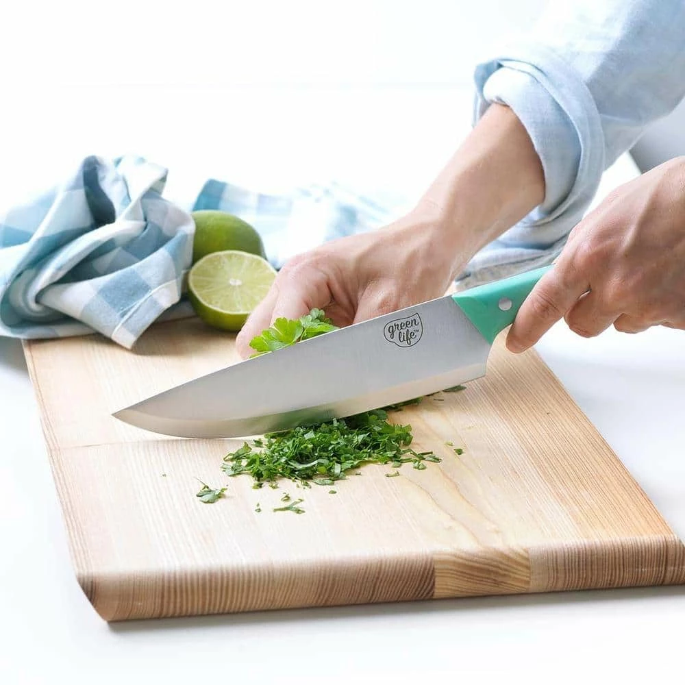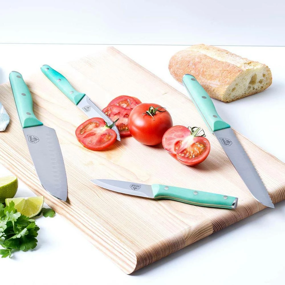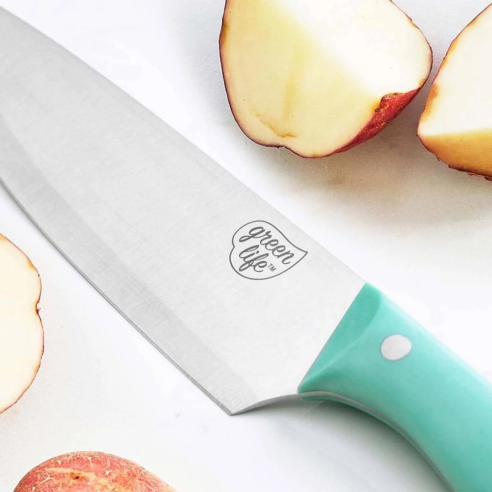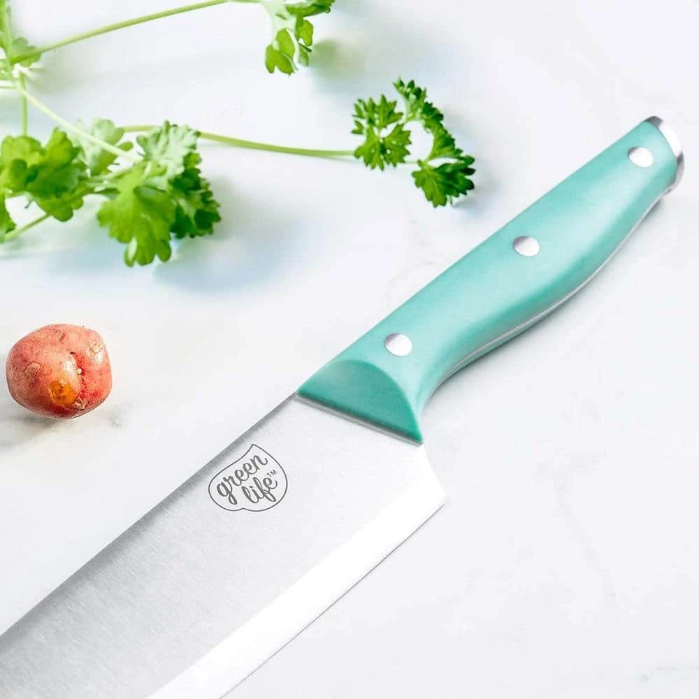 We’re talking cutting-edge stuff right here. GreenLife knives are more than pretty (though they’re that, too). The hand ground stainless steel blades deliver extraordinary precision, and our Soft Grip handle is elongated for a more comfortable grip. Each blade has an 18˚ angle to optimize cutting power and they’re extra thick for superior stability. The slopped bolsters provide comfort and control while the triple riveted and full tang construction ensure long lasting durability. Each knife is rust resistant for long term use. Cutlery set includes: 3.5 in. paring knife, 5 in. serrated knife, 6 in. utility knife, 7 in. Santoku knife, 7.5 in. bread knife, 8 in. chef’s knife, 6 steak knives, and a rubberwood knife block. Hand wash only.