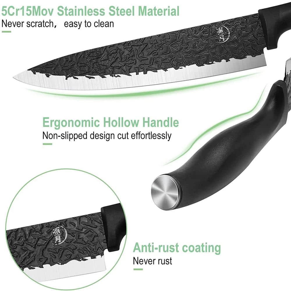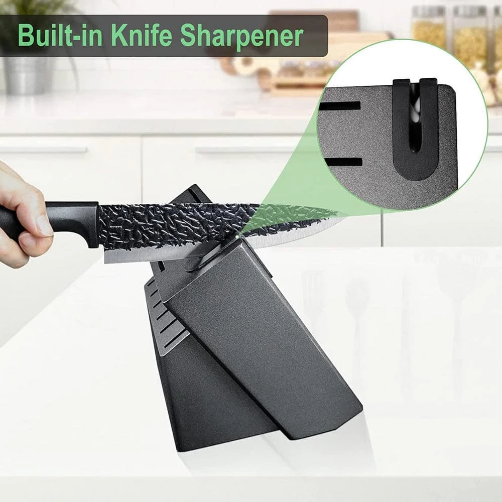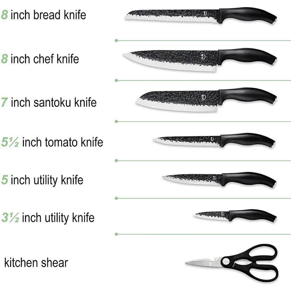 - Set included: 8 inch chef knife, 8 inch bread knife, 7 inch santoku knife, 5.5 inch tomato knife, 5 inch utility knife, 3.5 inch paring knife, 6pcs 4.5 inch steak knife, kitchen scissors, acacia wood knife block with build in sharpener