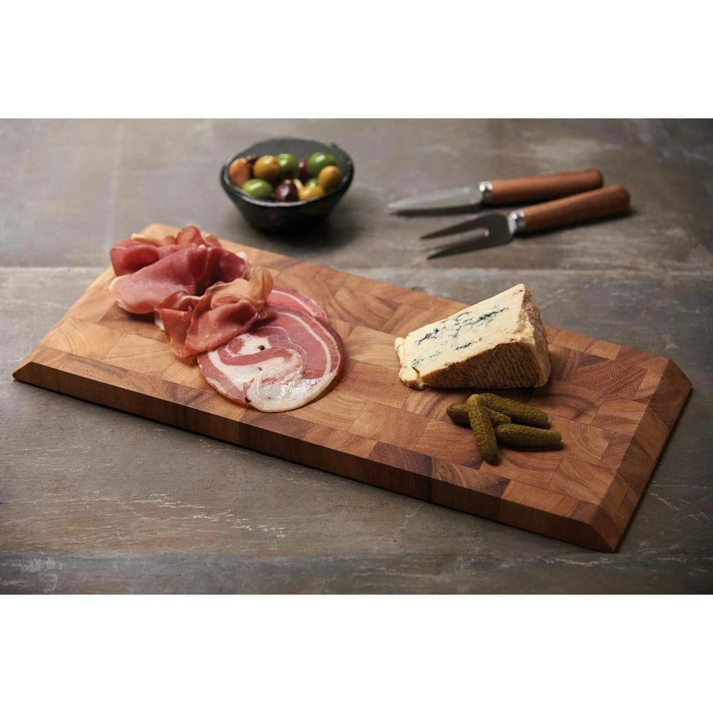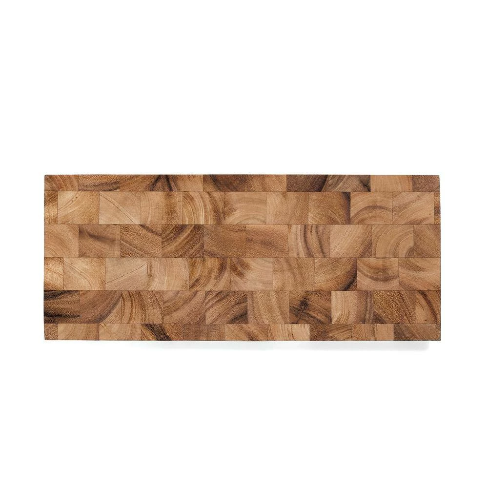 A perfect way to serve your prepared meats. This Bowery End Grain Cheese and Charcuterie Board is made from gorgeous acacia wood. Unlike traditionally made boards, end grain construction is less dulling to cutlery because the wood grain direction accommodates cutting instead of resisting it. Wear and tear is minimized on both cutlery and on the board, giving more longevity to all your cutting tools. and features a stainless steel grommet for easy hanging and storage. Elegant and functional, this board will look stunning and be of use for years to come. Preparation and presentation, all in one. **Use and Care** Wash Ironwood products in warm, soapy water and thoroughly rinse with clean water. Do not soak. To dry, prop up off of counter to allow all surfaces to air dry evenly. Wood products should never be washed in the dishwasher. After drying, rejuvenate and protect the wood by rubbing it down with Ironwood Butcher Block Oil. Apply the oil liberally and allow it to soak in thoroughly before use. Regular application of our Butcher Block Oil will prevent cracking and preserve the rich natural colors of the wood.