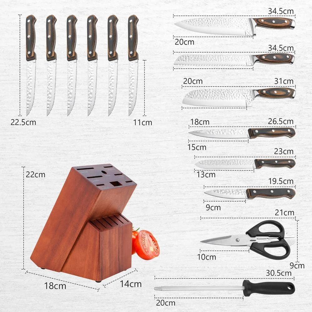 - Package Includes: 1 x 8-Inch Chef Knife 1 x 7-Inch Santoku 1 x 8-Inch Seratted Bread Knife 1 x 6-Inch Salman Knife 1 x 5-Inch Utility Knife 1 x 3.5-Inch Paring Knife 6 x 4.5-Inch Steak Knife 1 x Kitchen Shears 1 x Sharpener 1 x Wood Block