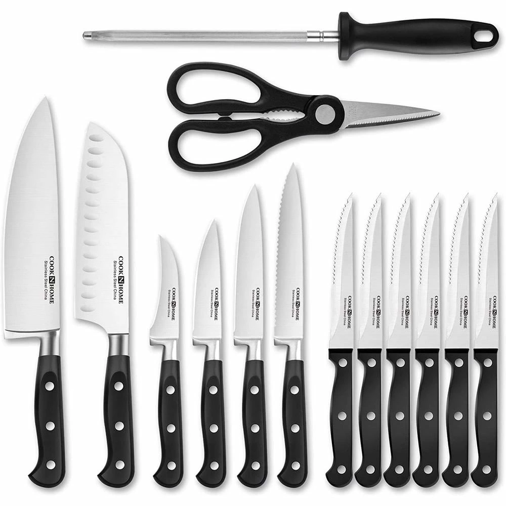 The Cook N Home 15-piece knife set with bamboo storage block, stainless steel Includes: 8 in. Chef’s knife, 8 in sharpening steel, 7 in. Santoku knife, 5 in serrated utility knife, 4.5 in. Utility knife, 3.5 in. Paring knife, 3 in. Peeling knife, six of 4.5 in. Steak knives, kitchen scissors, and a bamboo storage block. Knives are made of high carbon stainless steel for sharpness and balance. Full tang construction with 3-rivets provides durability. Wood block included to hold all knives. Handle is ergonomically designed for Comfort and Bakelite handle is hygienic. Steak knives and bread knife are serrated for easy slicing. Not dishwasher safe.