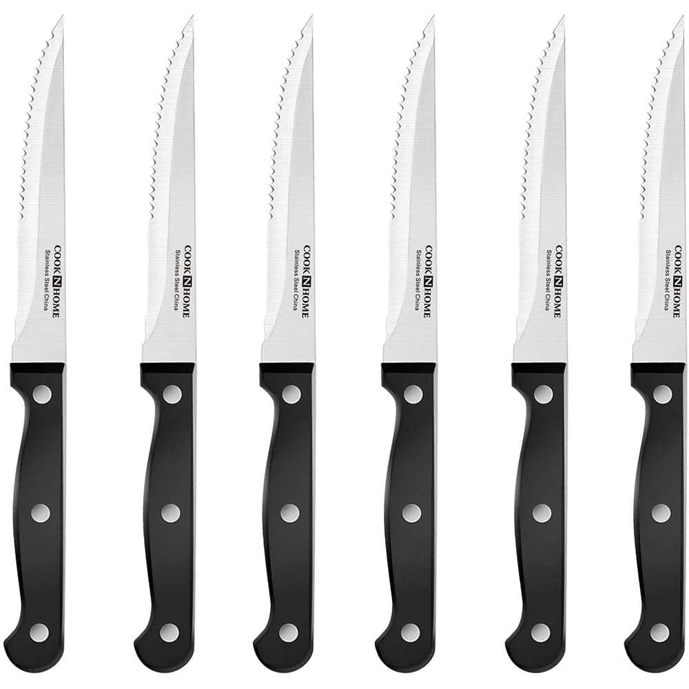 - Steak knives and bread knife are serrated for easy slicing; not dishwasher safe