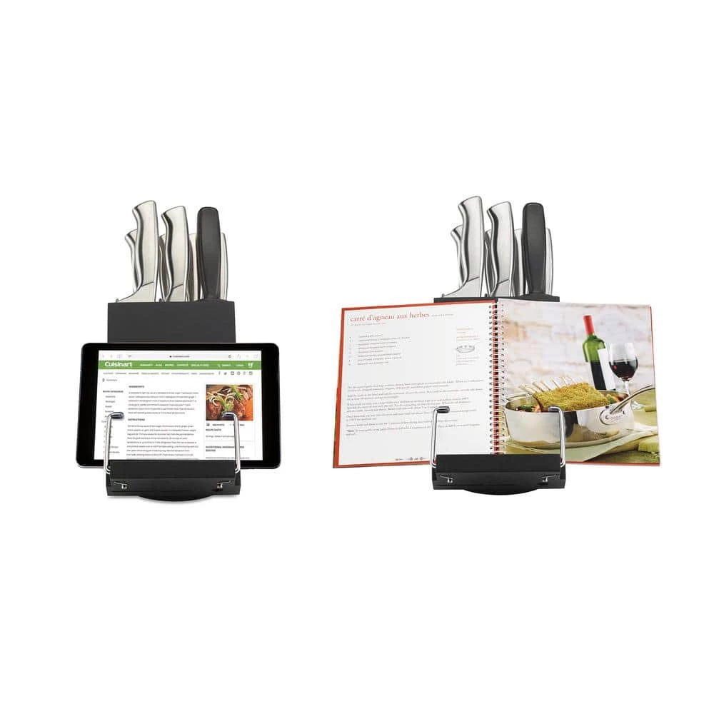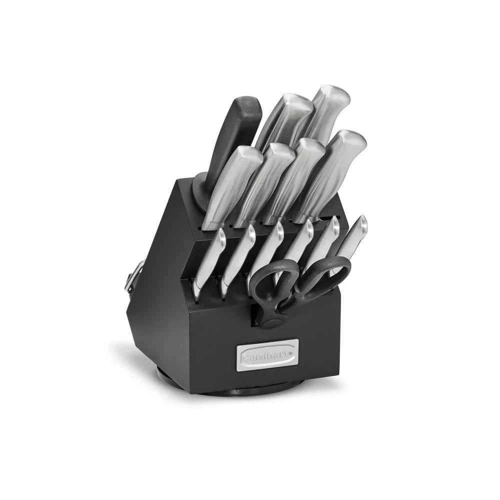 Sleek style and convenience come together in this Cuisinart Classic Stainless Steel rotating knife block set. Precision-tapered ground blades gradually narrow to an extremely sharp, fine edge, and each knife has a forged durable, extra-wide safety bolster for perfect stability and control. The block rotates 360 degrees for easy access, and a ledged back with wires holds any cookbook or tablet in place safely.