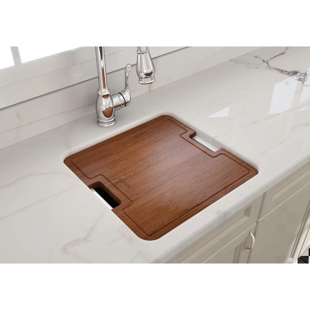 Wooden Cutting Board designed for use with BOCCHI 1359 Sotto sink. Made from food grade safe sapele mahogany. Features convenient channel for direct drainage into the sink to keep a more hygienic surface.