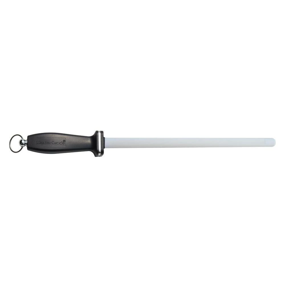 Impact-resistant white Ceramic Rod with 2-stripes, Straight end cap, 9-Mohs, Rod Length 11 in. Dia 0.6 in. Handle length measures 5 in. Plastic handle with hanging loop. The best quality and workmanship. Manufactured by Master Grade, the expert in the sharpening. Made in Taiwan.