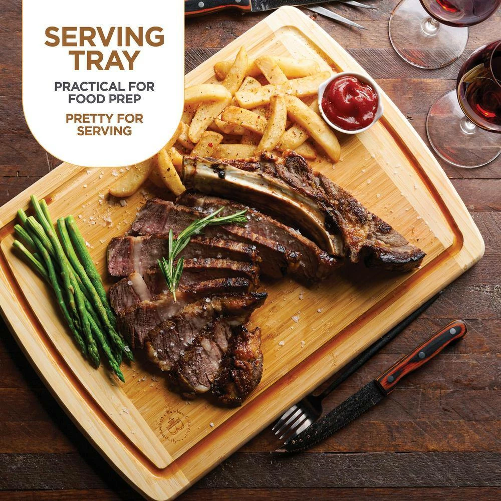 Bambusi equips with the best cutting board according to your cooking style. From our uncompromising bamboo deep design to our custom shape construction, this large cutting board is very functional to prep your ingredients in one surface without the need to move things off the board. With the perfect weight and outstanding surface mechanism, our bamboo cutting board stay in place on your countertop so you can get things going. Mess-Proof and Convenient The rigorous construction of the drip groove is engineered to hold up to 1 oz of juices and liquid from spilling all over your counter. Bambusi chopping boards are tailor-made with professional chefs in mind to satisfy every aspect of managing the kitchen more efficiently. Size Dia 18 in. W x 12 in. H 3/4 in. Thick.