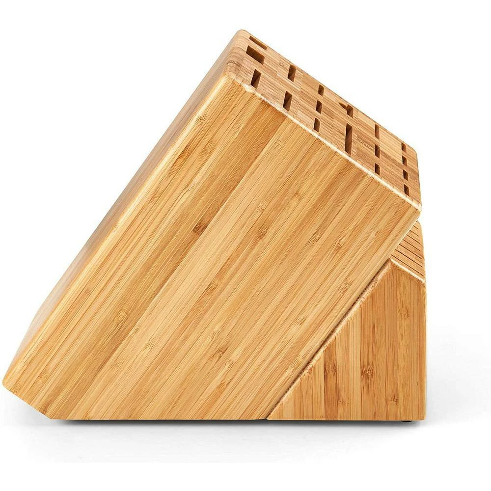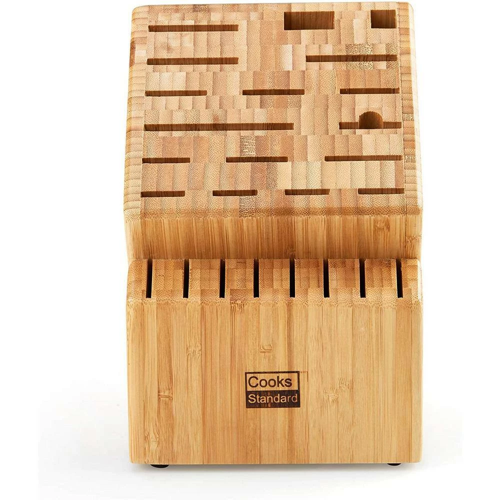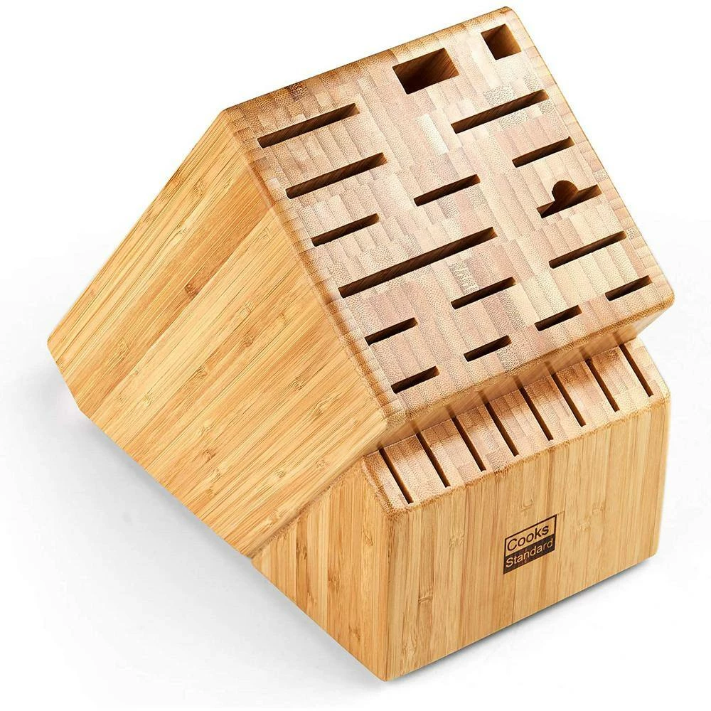 The Cooks Standard knife storage block, Bamboo, 25 Slots is made of natural Bamboo that is durable and looks great. It holds most commonly used knives and accessories up to 9 in. deep. 25 Slots widths range from 3/4 to 3 1/4 in. and holds chef’s, steak, wide and long knives, and a cleaver. Wider slots can hold a kitchen scissor, sharpening steel, and other items. Angled slot to grab knives easily. Rubber feet prevents block from slipping. Dimensions are 11. 5 in. Length, 9. 5 in. Height, and 6. 5 in. Width. Wipe with cloth to clean.