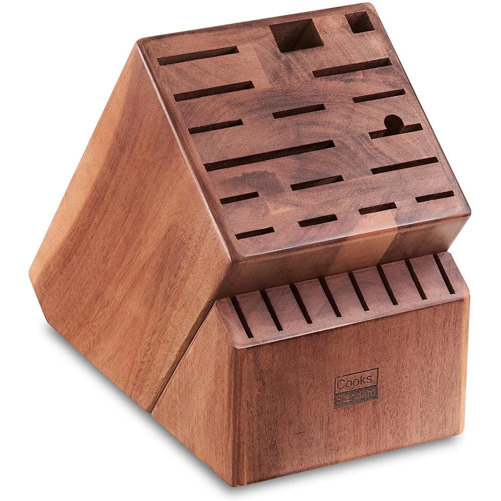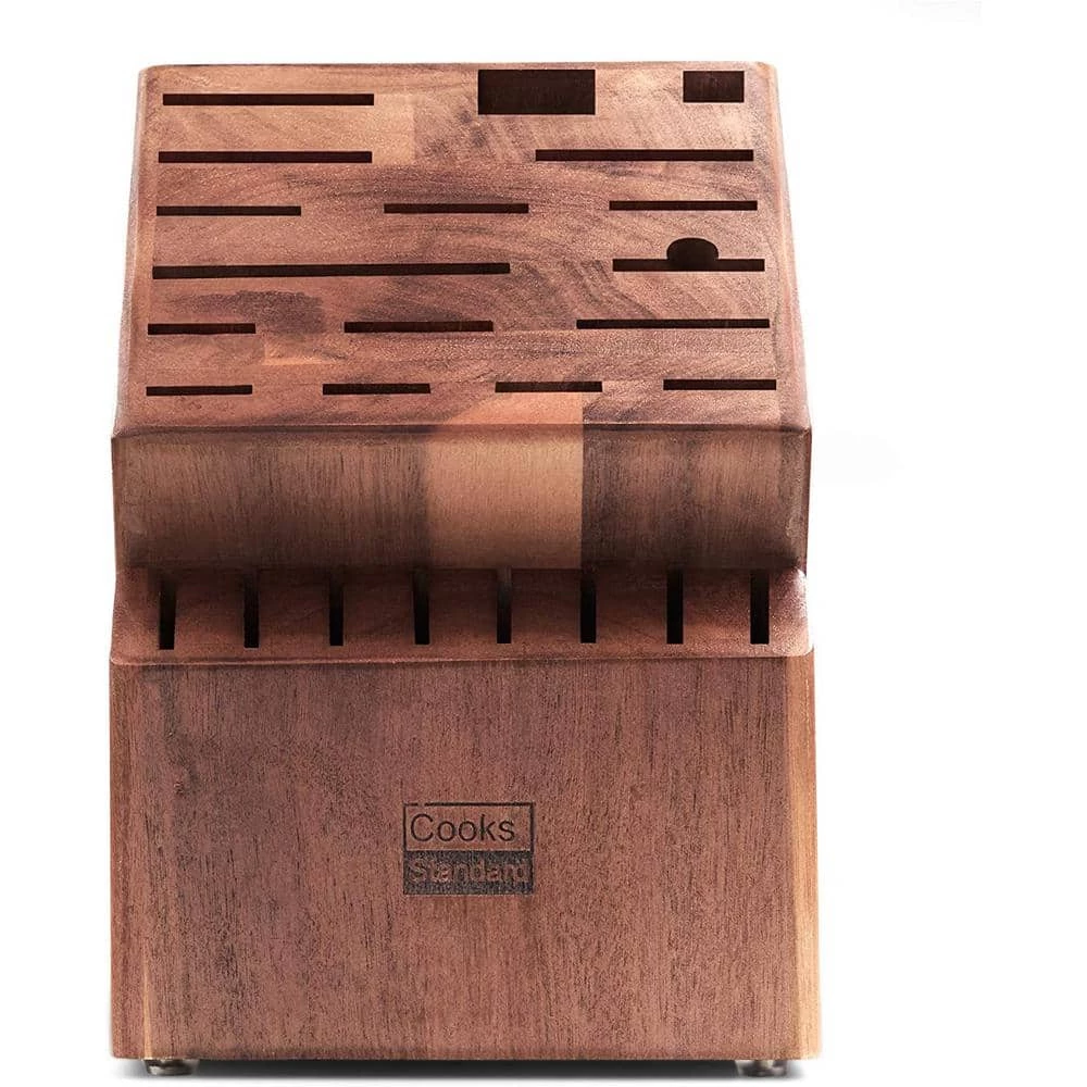 The Cooks Standard knife storage block, Acacia, 25 Slots is made of natural Acacia that is durable and looks great. It holds most commonly used knives and accessories up to 9 in. deep. 25 Slots widths range from 3/4 to 3 1/4 in. and holds chef’s, steak, wide and long knives, and a cleaver. Wider slots can hold a kitchen scissor, sharpening steel, and other items. Angled slot to grab knives easily. Rubber feet prevents block from slipping. Dimensions are 11. 5 in. Length, 9. 5 in. Height, and 6. 5 in. Width. Wipe with cloth to clean.
