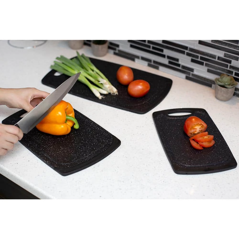 The richly, grained look of real granite with out the weight, this set of plastic cutting boards feature a double sided work surface that helps prevent cross-contamination and mixing of flavors. The set features 3- distinct sizes to fit all your food prepping needs, along with a deep groove lip around the edges for catching excess juices. Each feature a thick and sturdy plastic construction with a gentle surface that is gentle on your knife’s edge. along with rubber sides to keep the cutting boards in place as you chop.