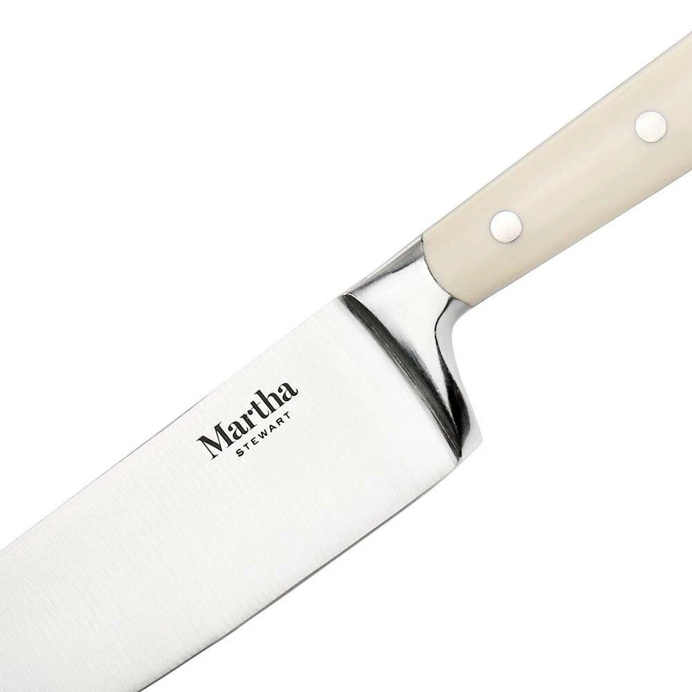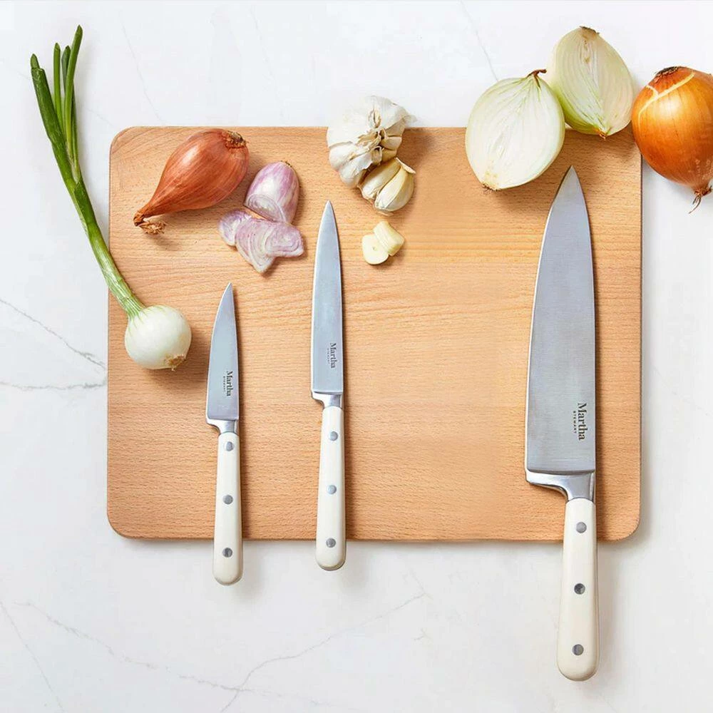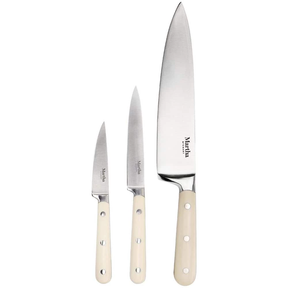 The key to slicing with precision, ease, and confidence? Practice and the right knives. With the Martha Stewart Essential Kitchen Knives Set in your kitchen, you will never have to resort to a dull blade or improper device, these three knives will accomplish almost all your food prep needs. Including a 5 in. utility knife, 3.5 in. paring knife, and 8 in. chef’s knife, Martha’s collection displays premium craftsmanship married to modern design. The blades are forged from high stainless steel that has been taper-ground for razor-sharp edges and are securely fitted in triple-riveted handles for balance, comfort, and control.