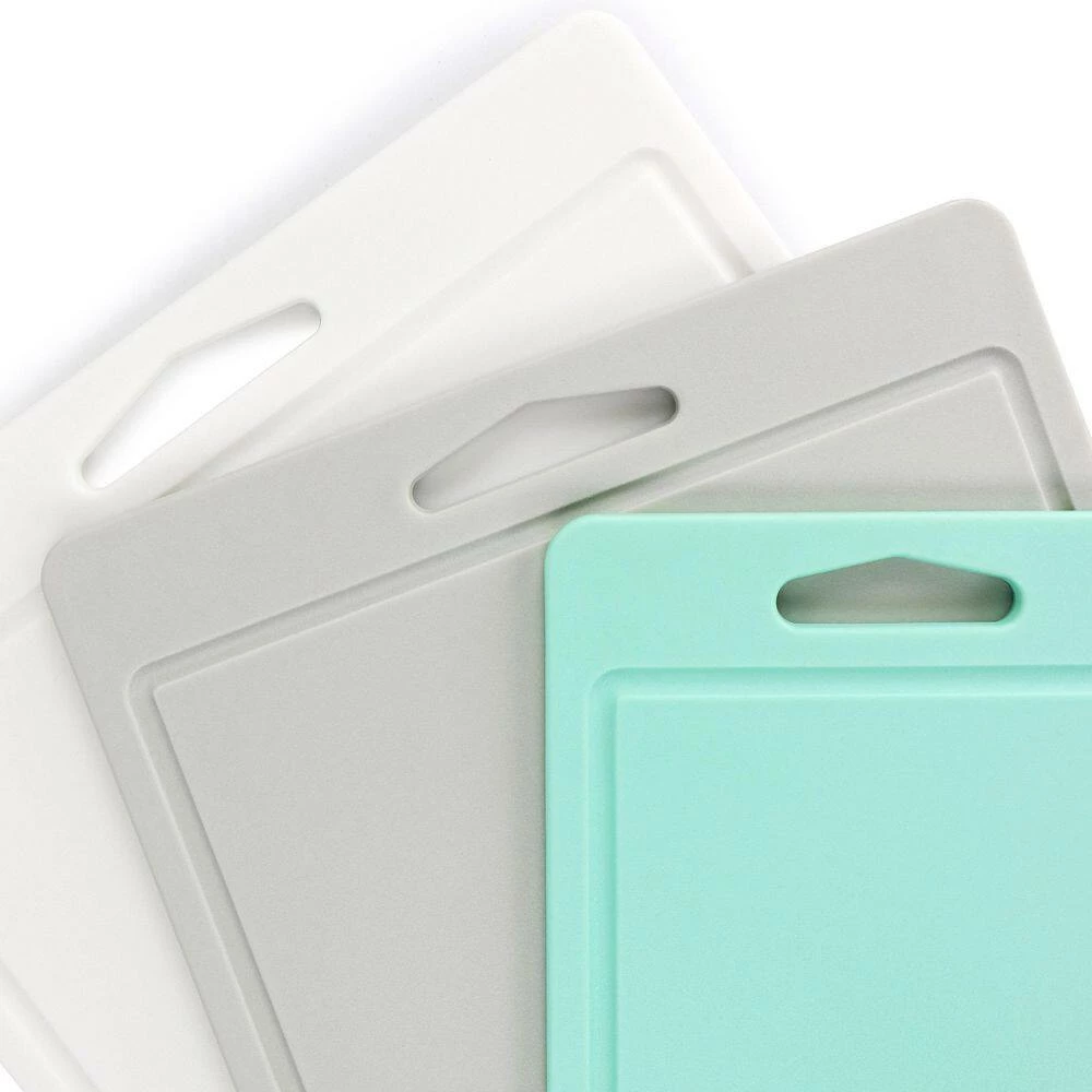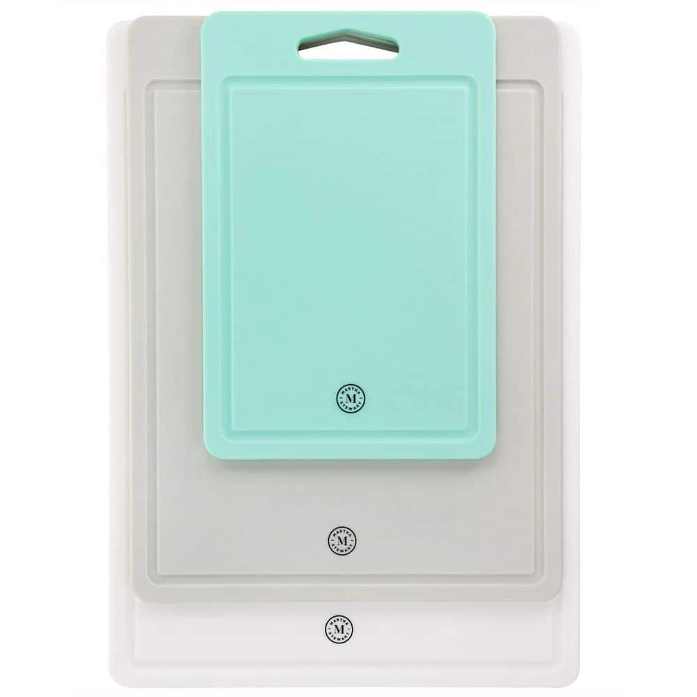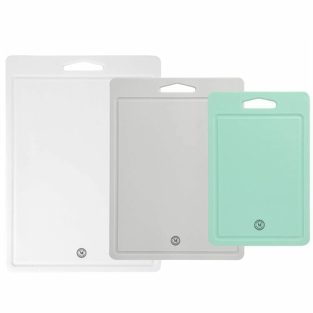 - Set includes: One 18 in. x 13in cutting board, one 16 in. x 12 in. cutting board, and one 12 in. x 8 in. cutting board