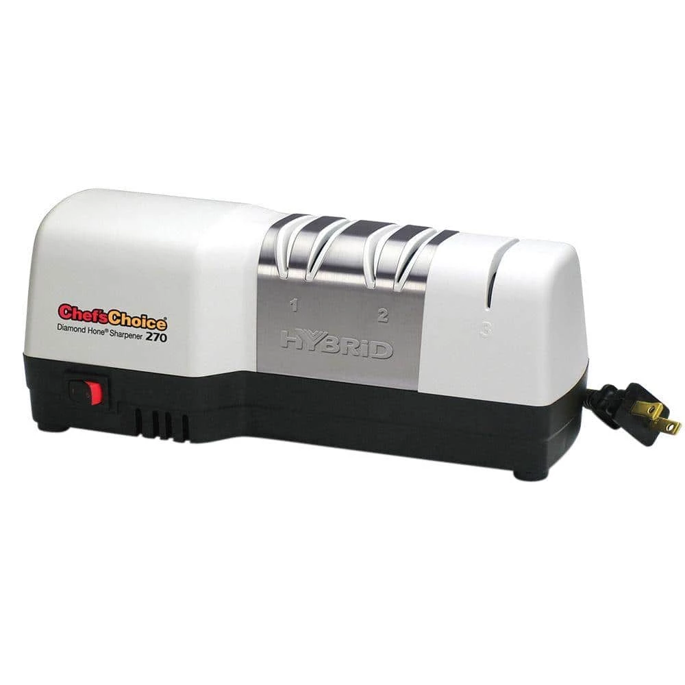 The most advanced hybrid yet with acclaimed Criss-Cross sharpening technology. Electric and manual sharpening stages that provide superior edge geometry and razor sharp edges on both straight edge and serrated knives including household and kitchen knives, sports knives and pocket knives. The diamond abrasive wheels sharpen simultaneously “into” and “out-of” the edge for a superior burr-free edge. The Chef’sChoice CrissCross sharpening technology is praised by home cooks and professional chefs for its extremely sharp edge with lots of “bite”.