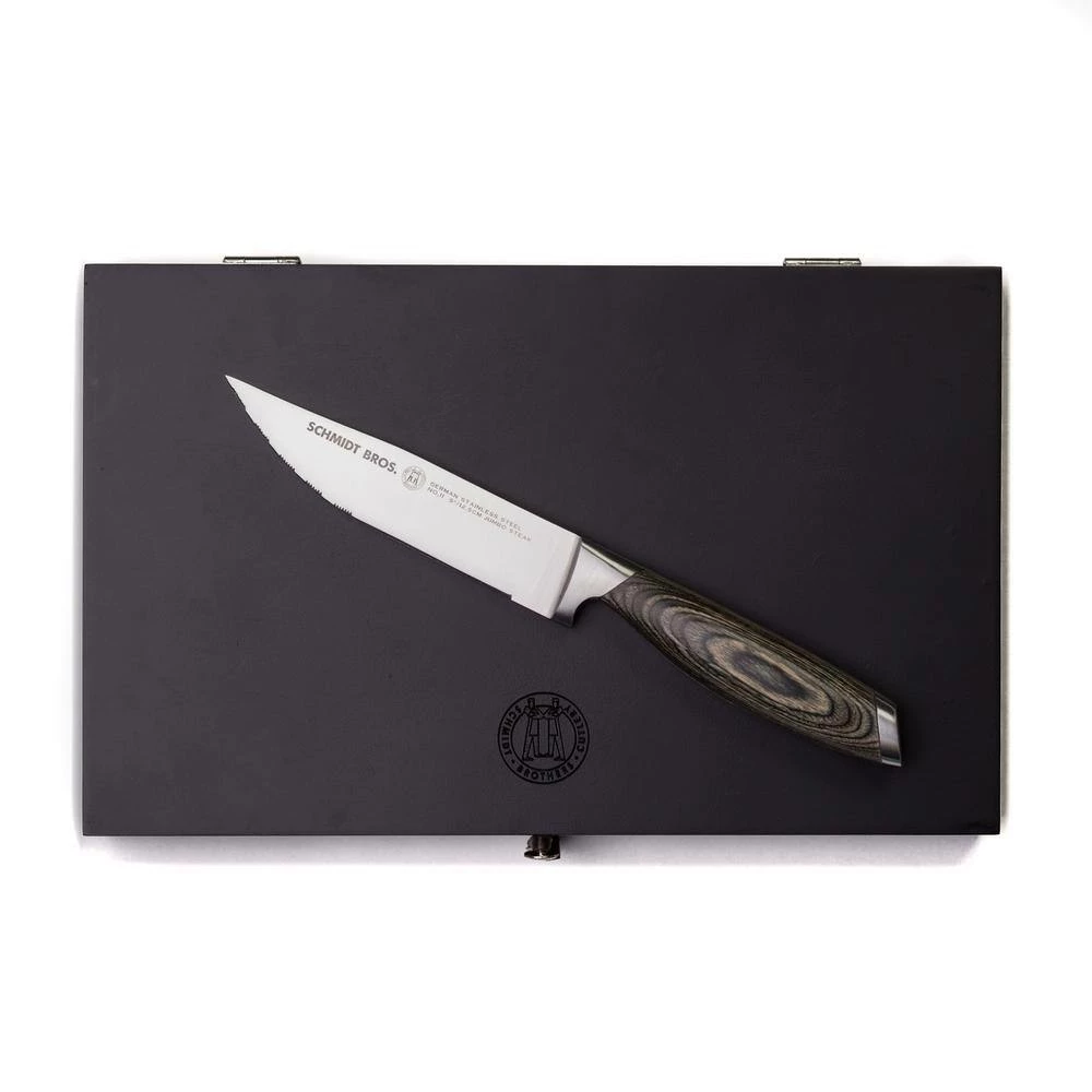 We call this exquisite steak set Bonded Ash because the 100% German stainless steel blades and the Ash Pakka Wood handles were designed to be in perfect harmony, giving you a precise and pleasurable cutting experience (as if steak wasn’t pleasurable enough already). The blades were wrought from a single piece of steel and feature the Schmidt Brothers original serrated edge for a clean follow through. This set comes with a finely crafted wooden storage box. Just wait till you get them into your kitchen. You’ll bond pretty quickly too.