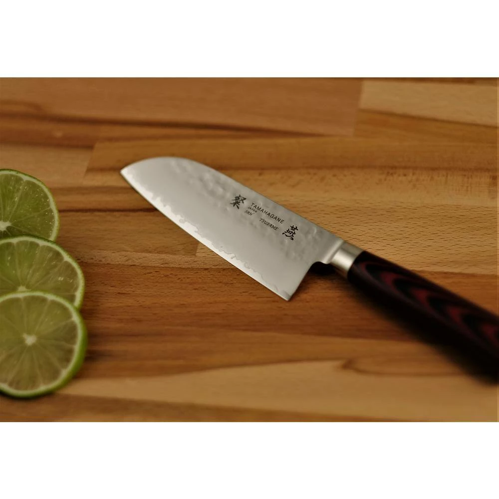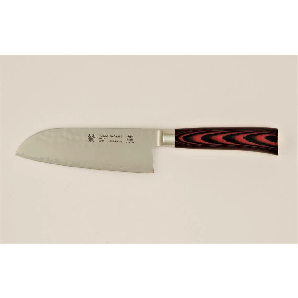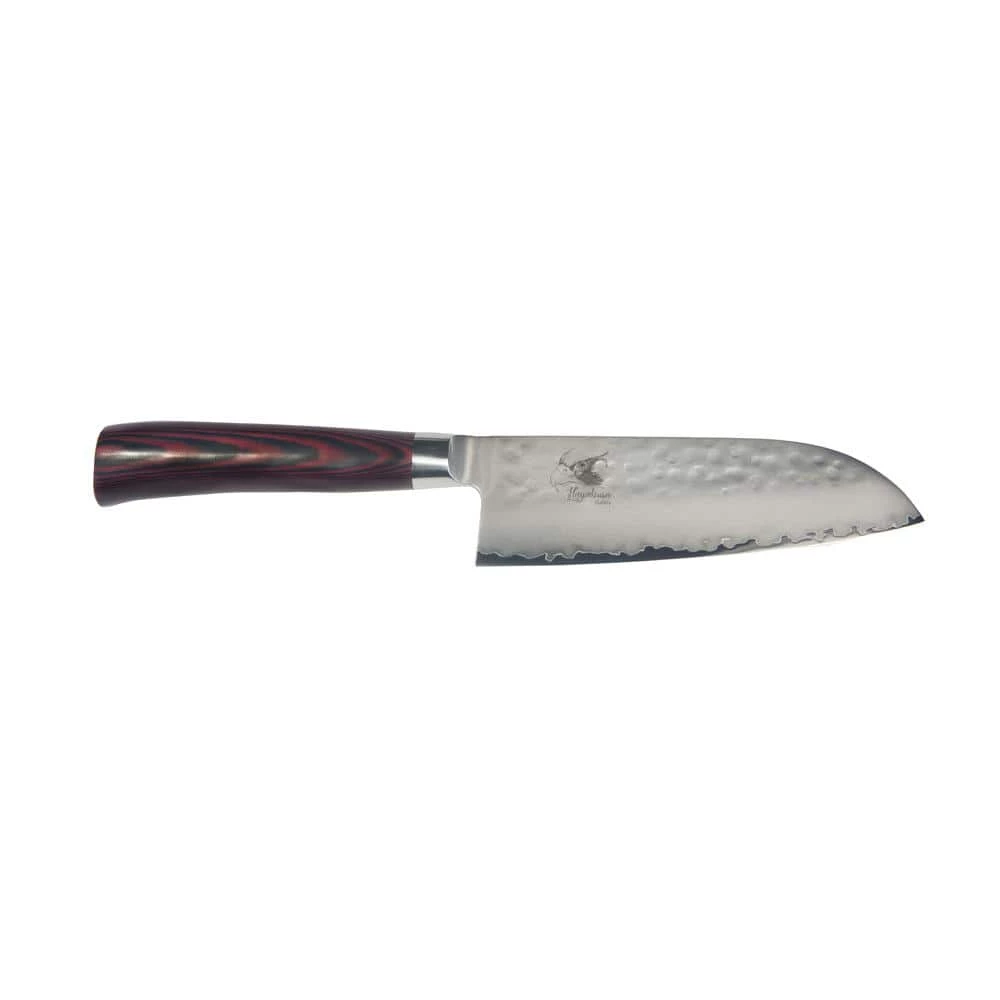 5 in. Santoku Knife. HAYABUSA Cutlery is made in Tsubame City, Japan exclusively for Ginkgo Int’l Ltd in the Kataoka kitchen knife factory. The area’s manufacturing history dates back some 400 years to the Edo Period starting with metal nails, venturing into samurai sword production, and now to some of the most sought after metal and kitchenware products in the country and around the world. The HAYABUSA Cutlery line is as beautiful as it is comfortable. Blades are finished with a hammered surface, and bead blast to accentuate the difference between the hard and soft layers.