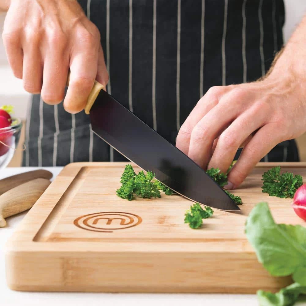 This MasterChef 5-Piece Knife Set comes with ergonomic, soft-touch handles for a comfortable and secure grip. The nonstick coated blades are made from durable stainless steel, for effortless cutting. This set includes 3.5 in. paring knife, 4.5 in. utility knife, 8 in. carving knife, 8 in. bread knife, and an 8 in. chef knife. This product is dishwasher safe, however hand-washing is recommended for longer life.
