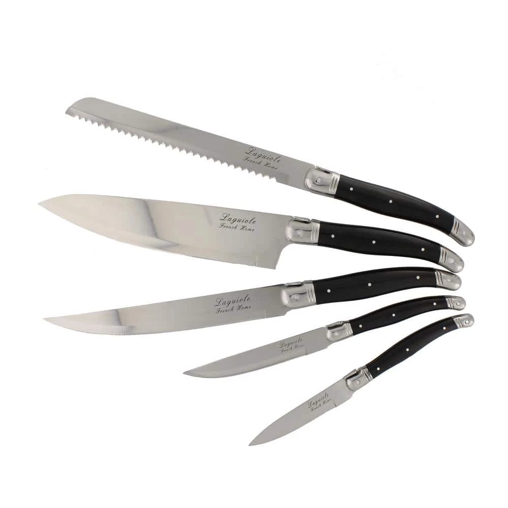 Whether carving a roast, chopping vegetables or slicing a loaf of fresh bread the French Home kitchen knife set is perfect for all your food preparation needs. 5-piece set includes a chef’s knife, carving knife, bread knife, utility knife and paring knife. The traditional French Laguiole design add an elegance to your kitchen and inspiration to your cooking. Attractive magnetic wood display for the knives makes them visible and easily accessible. The bee emblem on the knife signifies the Laguiole design. Laguiole is a town in the Aveyron region of southern France where this style originated.