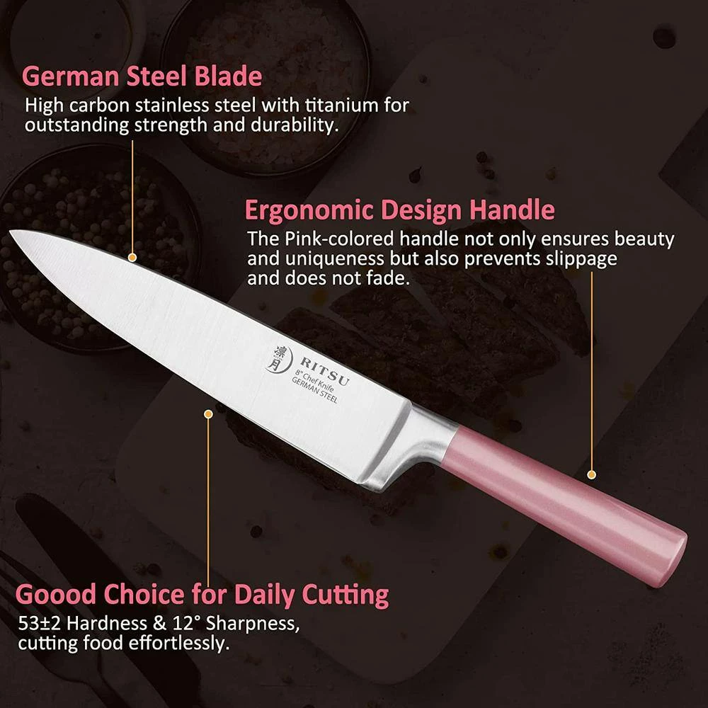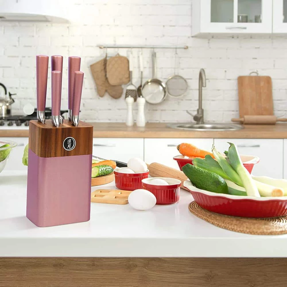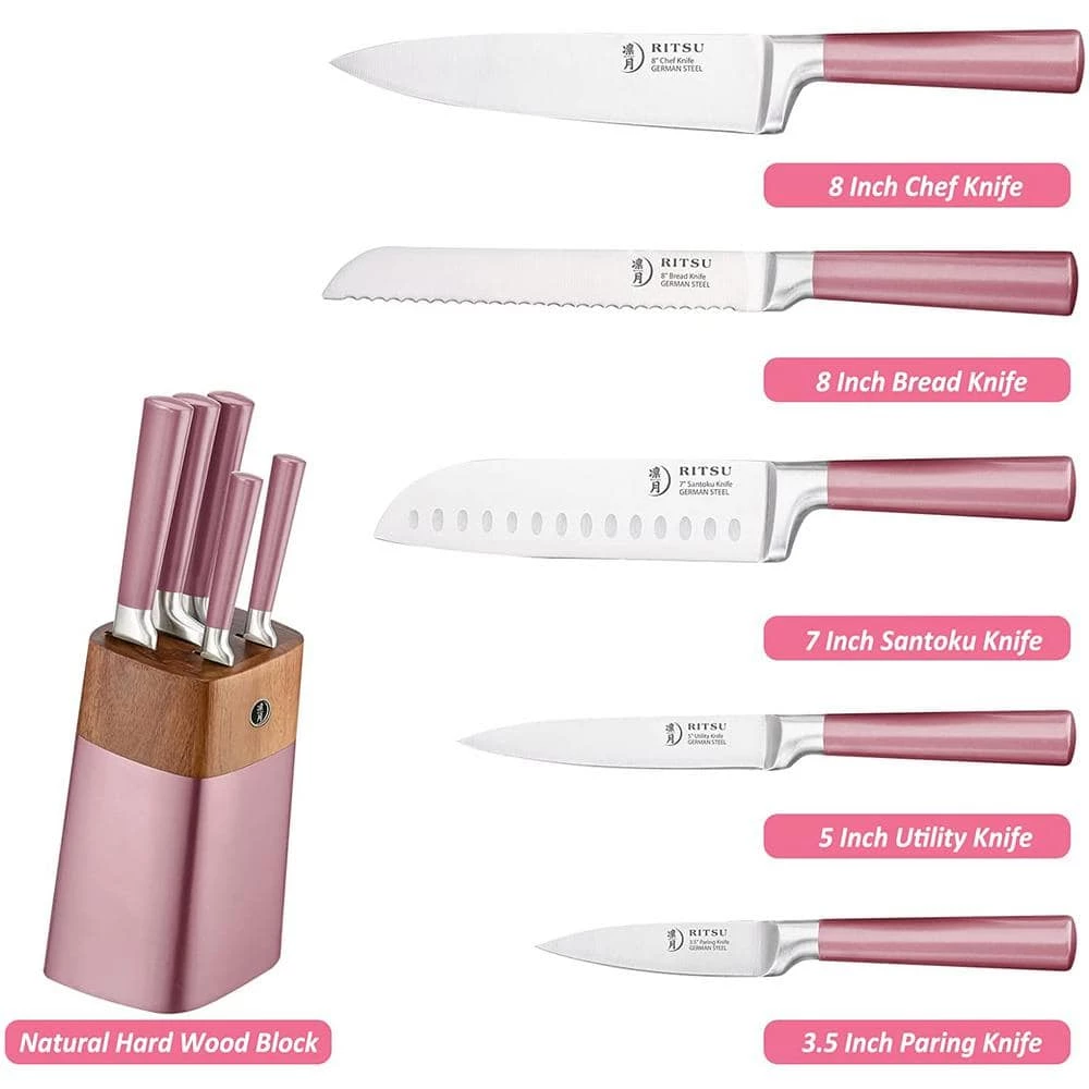 - Set included: 8″ Chef Knife, 8″ Bread Knife, 7″ Santoku Knife, 5″ Utility Knife, 3.5″ Paring Knife, and a sturdy Wooden Block