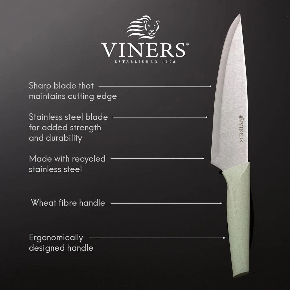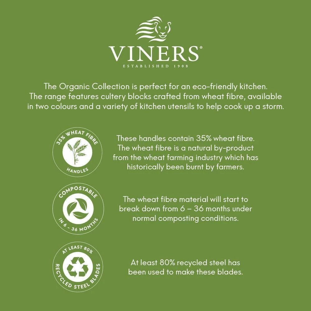 The VINERS Organic knife block is perfect for an ecofriendly home. The block and handles are crafted from 35% wheat fiber and at least 80% recycled steel has been used to produce the blades. The wheat fiber is a natural by product from the wheat farming industry which has historically been burnt by farmers.