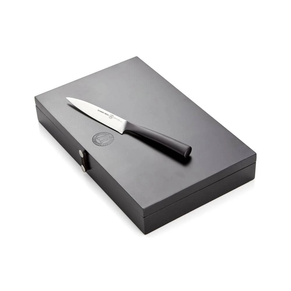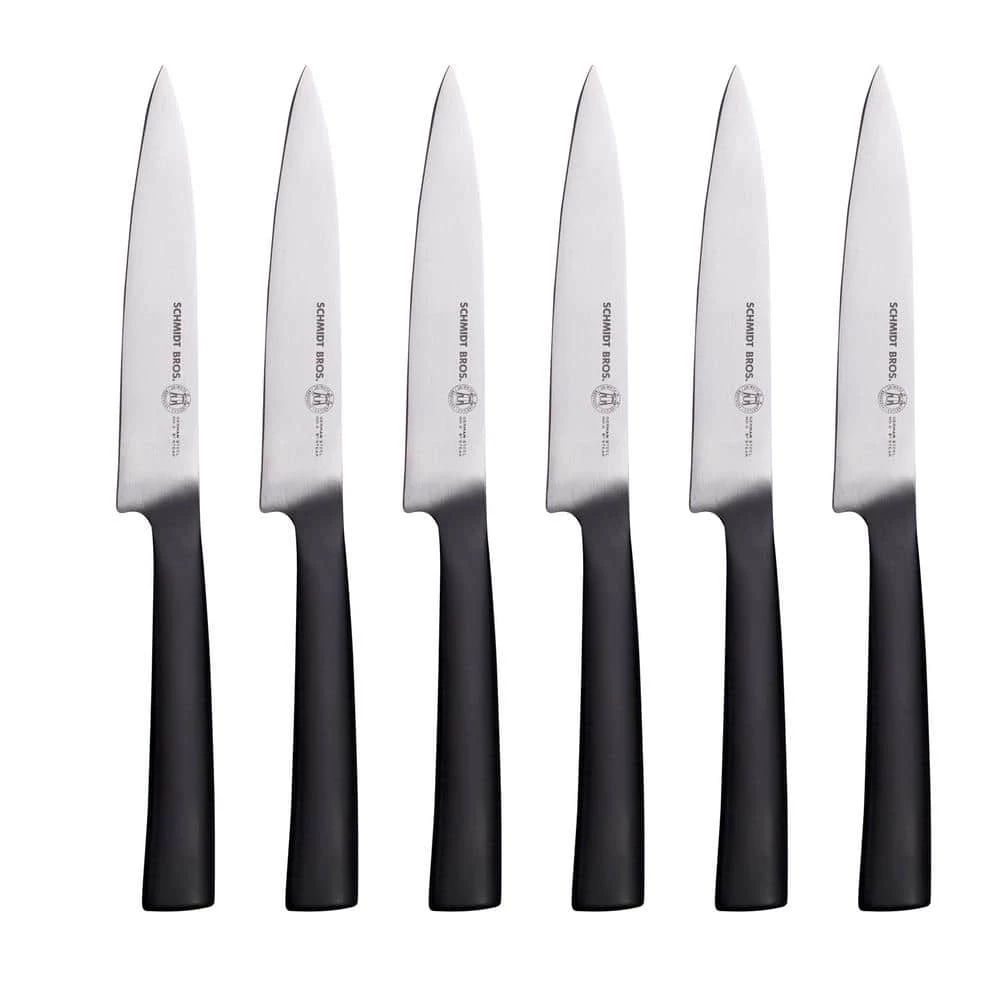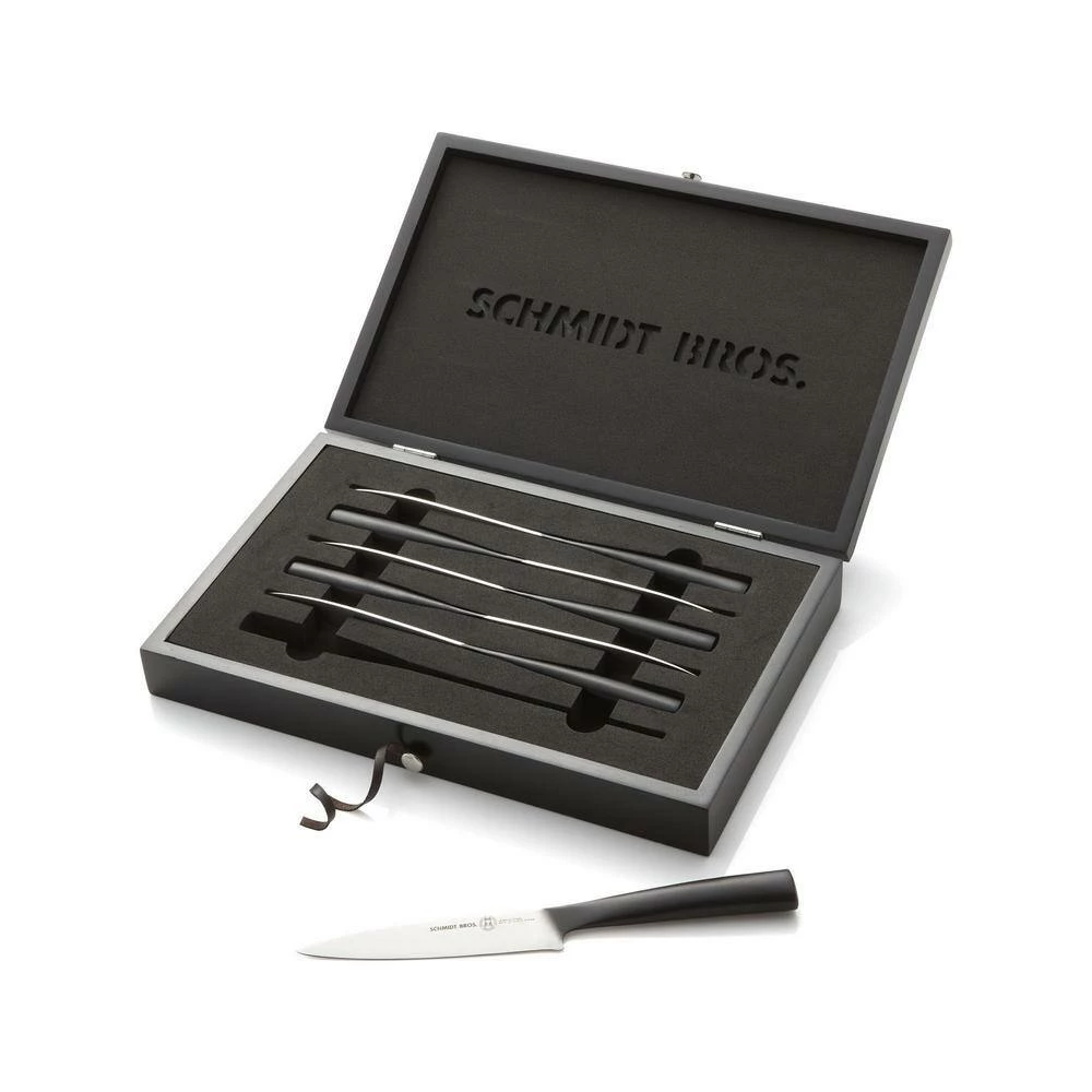 For best results, make your steak rare and your knives raw. The Carbon 6 worldclass 6-piece set from Schmidt Brothers – worldclass steak knives with ultra-sharp polished blades contrasting against raw, unpolished scorched steel handles. Each knife is made from a single piece of the finest 100% German Stainless Steel. And they have the patented Schmidt Brothers Curve so you can cut through that beautiful beef more easily. The Schmidt Brothers Carbon 6 Steak Set. Raw looking steak knives. Rarer craftsmanship.