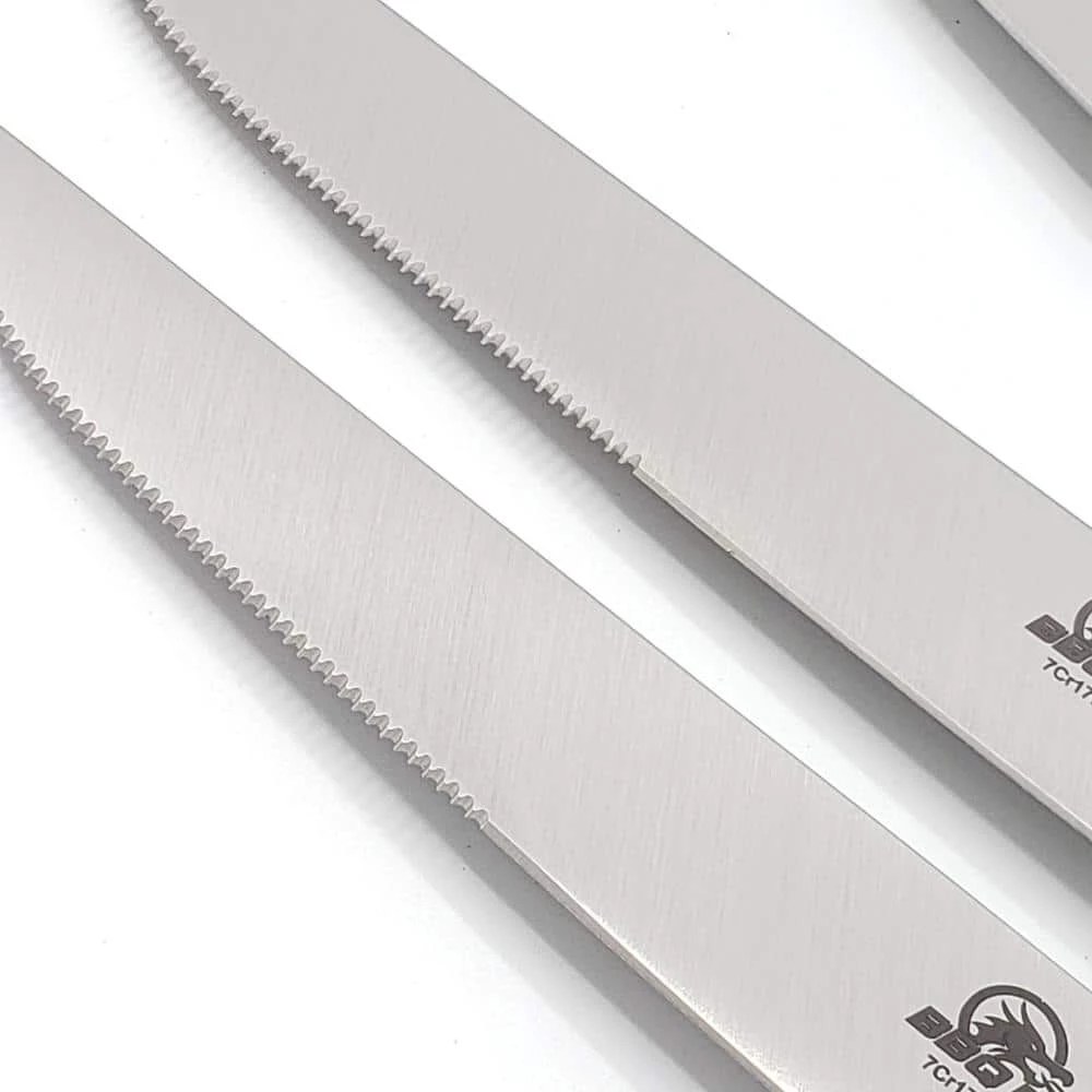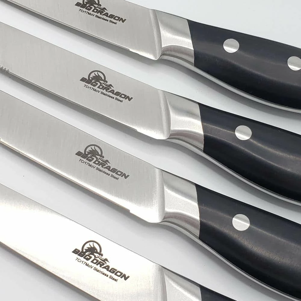 - We chose serrated blades for our BBQ Dragon premium steak knives because they stay sharp for years with very little maintenance the blades are made from an advanced 7cr17mov stainless steel, with a blade hardness of 51 to 55 HRC they will stay sharp and resist stains and scratches through years of tough use