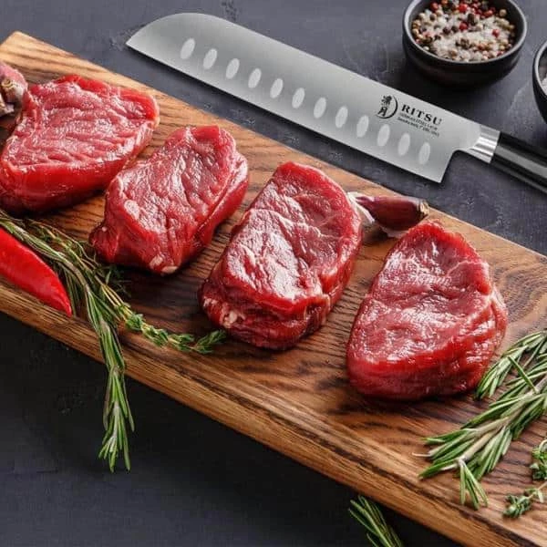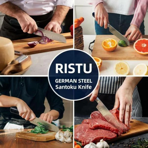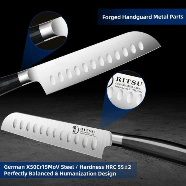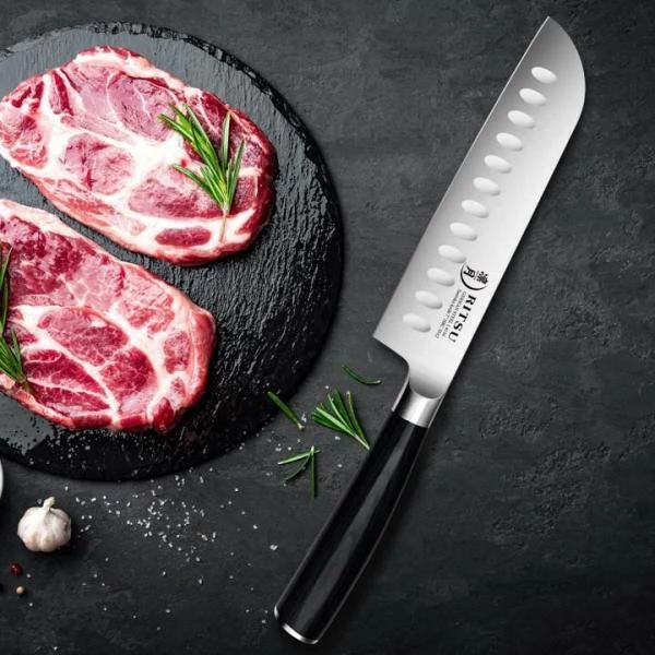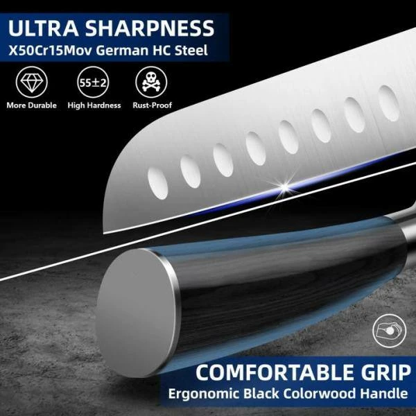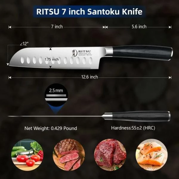 - Multi-functional santoku knife-circular hole-shaped recessed pattern design on the blade not only increases the aesthetics, but also reduces the cutting resistance, without food sticking on the blade, this pro chef’s knife can easily handle your daily kitchen tasks of chopping, slicing, mincing, dicing fruits, vegetables, ideal for meat fish, chicken and beef, it truly is the all-around utility knife and the top choice of both home chefs and pros