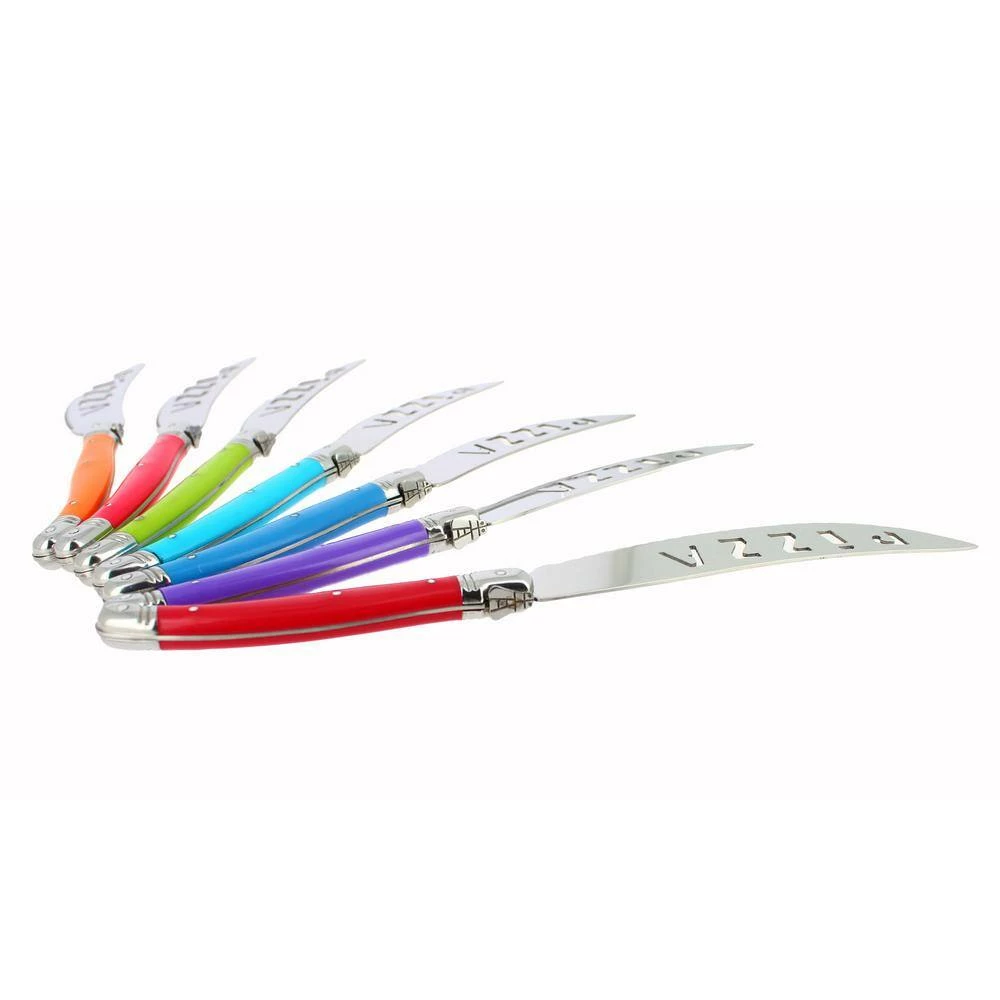 Hot and fresh – cheesy and delicious – everyone loves pizza. Now, you can host the ultimate pizza party and serve your slices with flair. Perfect for entertaining enthusiasts and pizza lovers alike this set comes with 6 individual pizza knives and a pizza slicer. The unique curved blade of the pizza cutter is specifically designed to slice through any pizza with ease. No more oddly shaped slices or missing out on bits of ooey gooey cheese. These Laguiole designed knives originated in France and are renowned for having a three rivet curved handle with a bee on its bolster. The bee is the symbol of Napoleon and the French monarchy. The handles of this set come in bright and bold rainbow colors celebrating individuality and inclusivity. French Home’s Laguiole knives are comfortable to hold, and the sharp stainless-steel blades effortlessly glide through any pizza crust. Comes with a wood tray for convenient storage and display. The best way to enjoy any slice. Bring on the pizza.