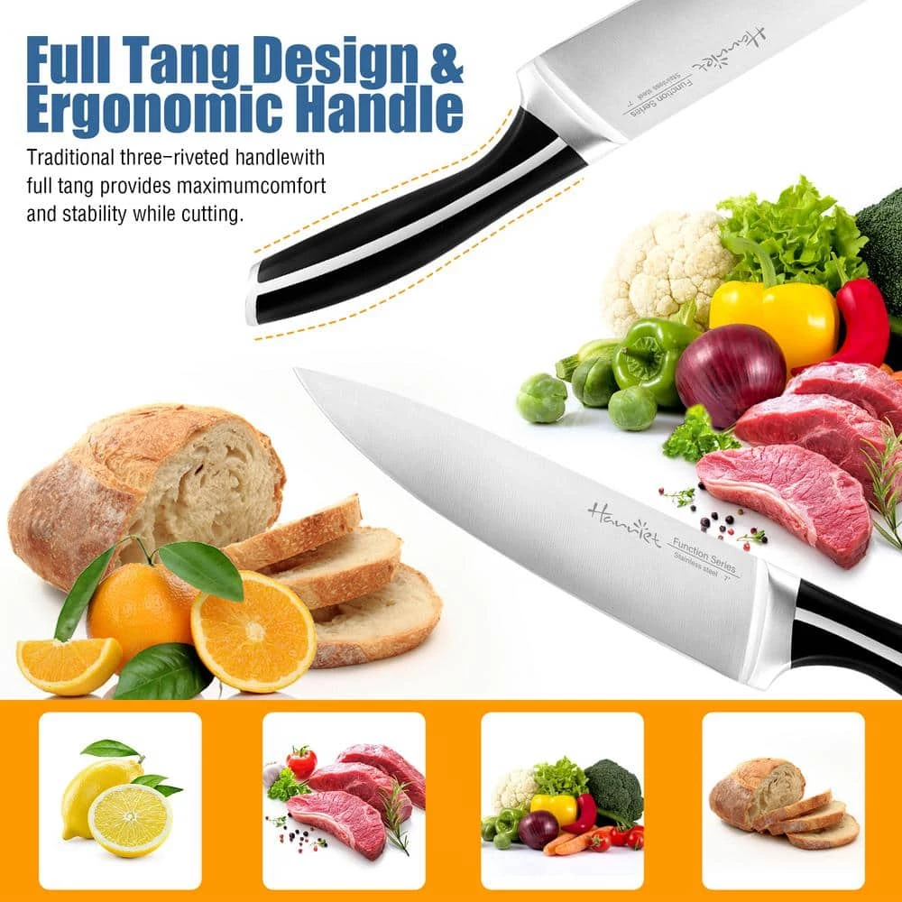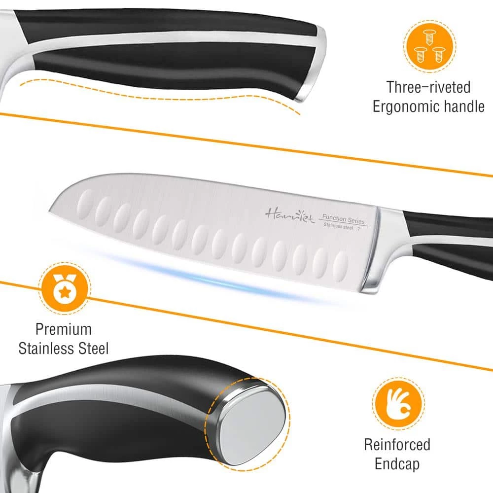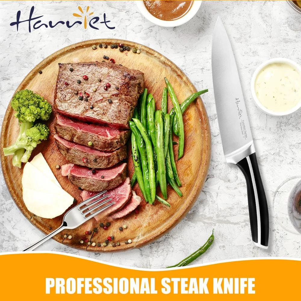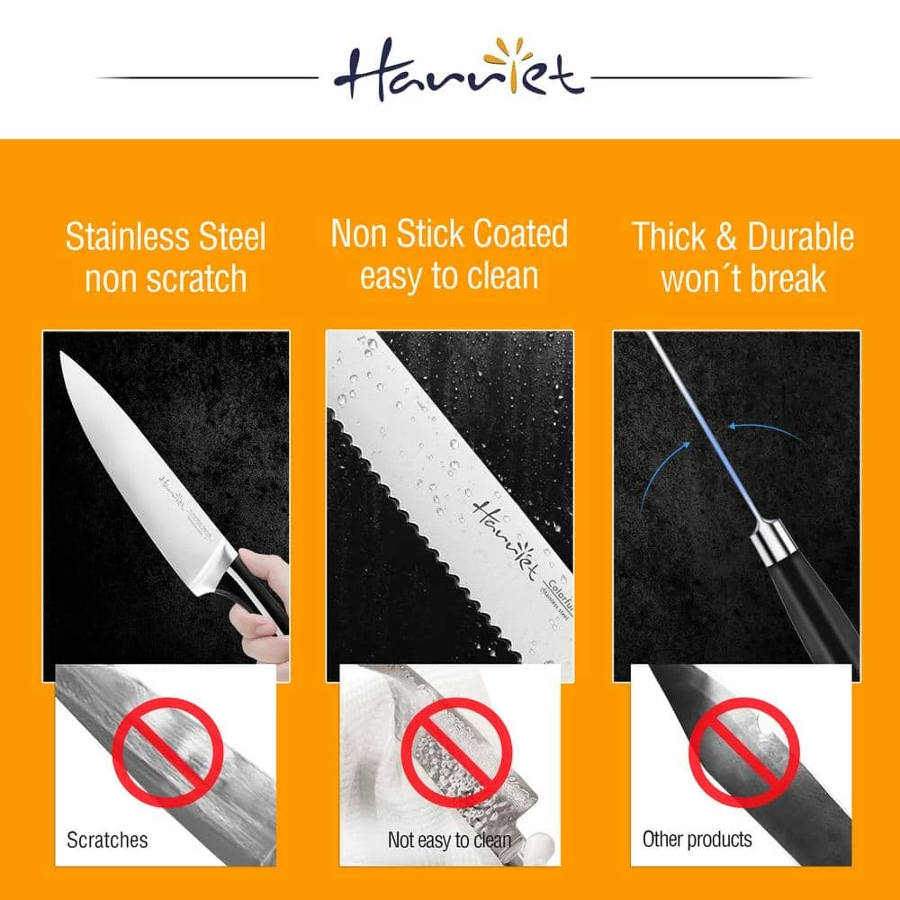 - Are suitable for all your needs including stripping, slicing, cutting, and chopping. Harriet knifes set consists of 8″ Chef Knife, 7″ Santoku Knife, 8″ Bread Knife, 5″ Utility Knife, 3.5″ Paring Knife, Knife Block, Knife Sharpener, and an Acacia Cutting Board.