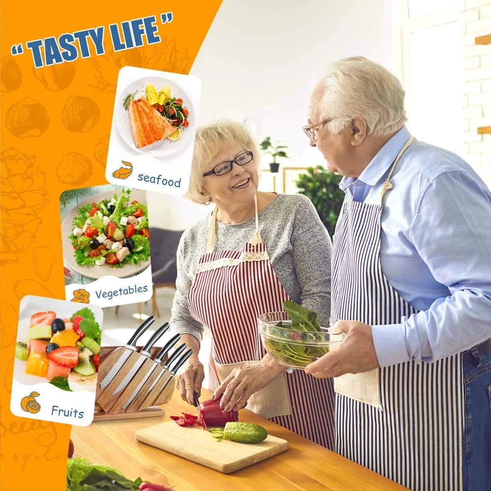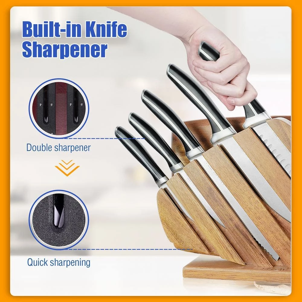 This unique design professional knife set with an acacia cutting board is the perfect addition to your kitchen. They are suitable for almost everything like cutting meat, fish, chopping fruits, vegetables, hardest bread crusts, hard cheese, etc.Harriet knife set with the block is made of premium high-carbon german stainless steel with excellent resistance to rust, corrosion, and discoloration.
