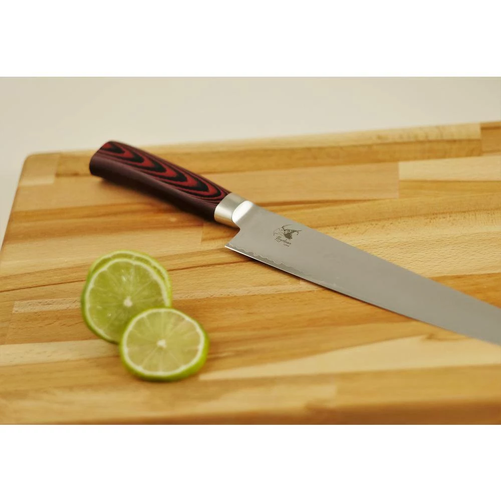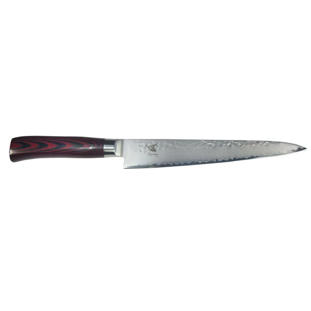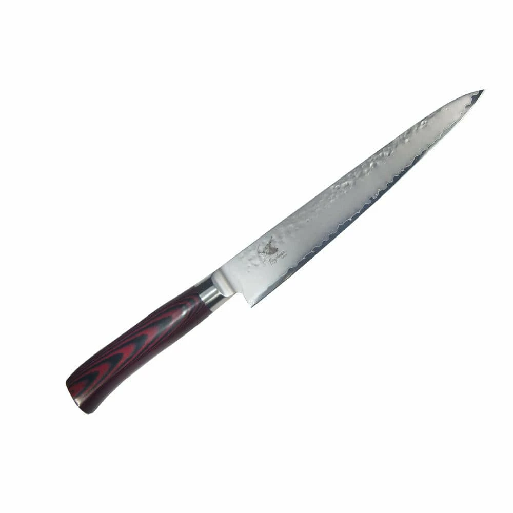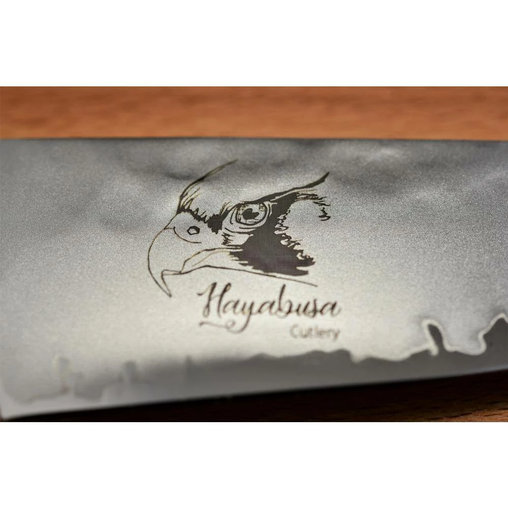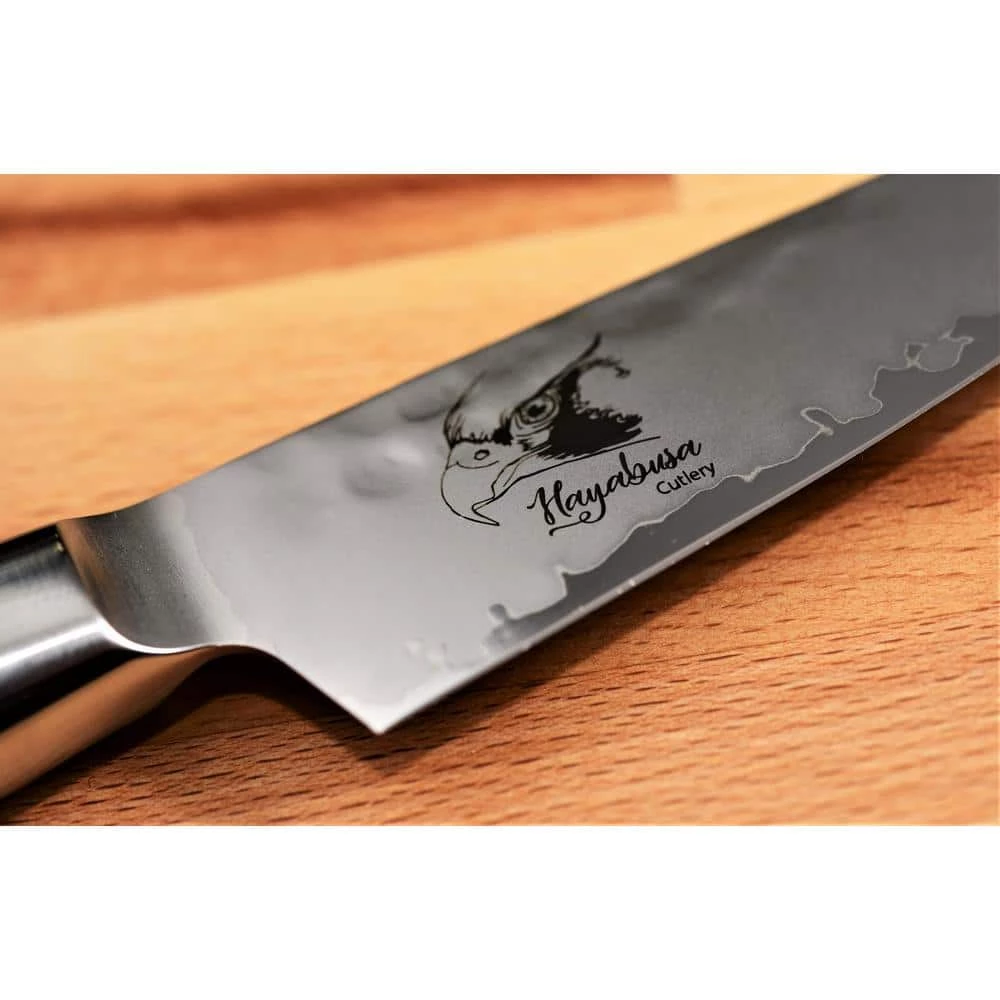 8.25″ Sujihiki Slicer. Hayabusa Cutlery is made in Tsubame City, Japan exclusively for Ginkgo Int’l Ltd in the Kataoka kitchen knife factory. The area’s manufacturing history dates back some 400 years to the Edo Period starting with metal nails, venturing into samurai sword production, and now to some of the most sought after metal and kitchenware products in the country and around the world. The Hayabusa Cutlery line is as beautiful as it is comfortable. Blades are finished with a hammered surface, and bead blast to accentuate the difference between the hard and soft layers.