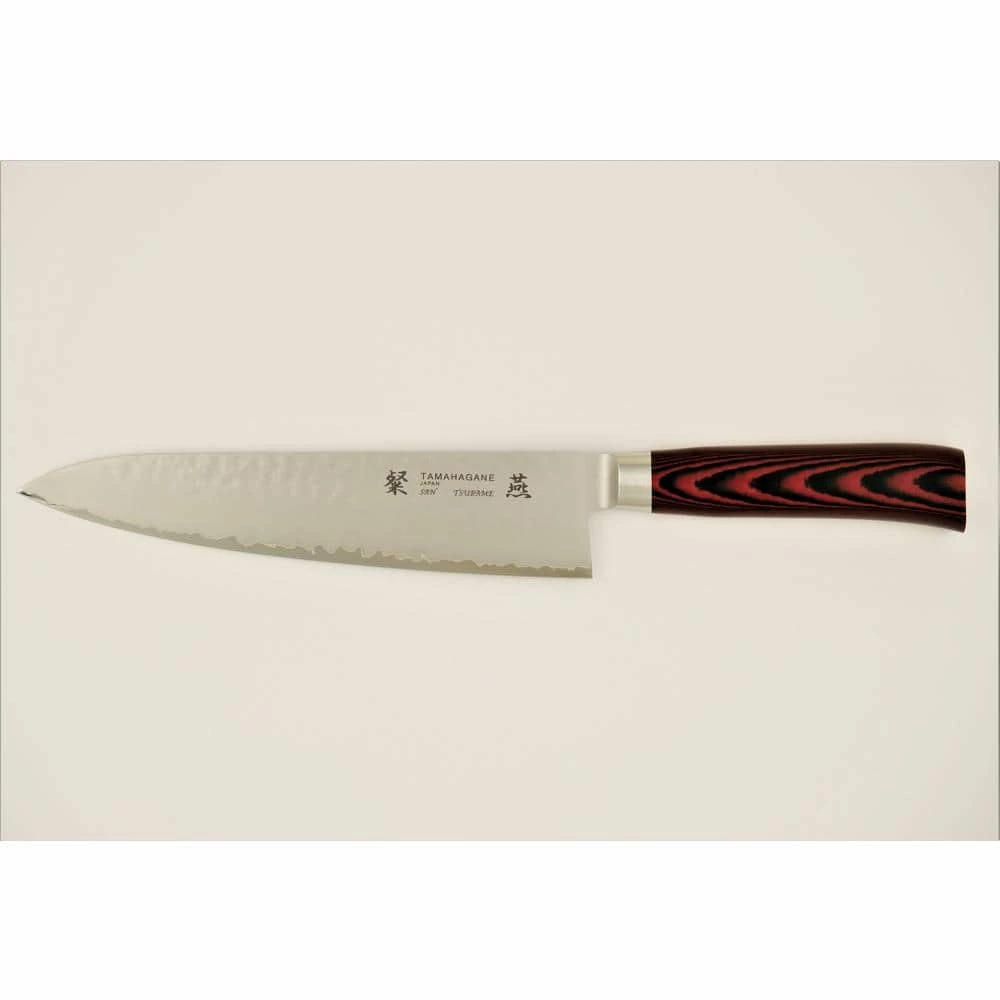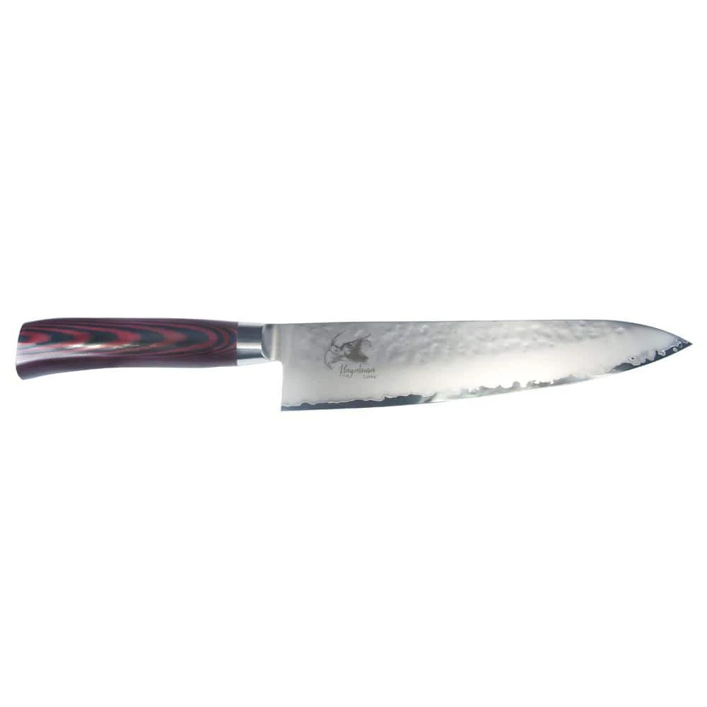8 in. Chef Knife. HAYABUSA Cutlery is made in Tsubame City, Japan exclusively for Ginkgo Int’l Ltd in the Kataoka kitchen knife factory. The area’s manufacturing history dates back some 400 years to the Edo Period starting with metal nails, venturing into samurai sword production, and now to some of the most sought after metal and kitchenware products in the country and around the world. The HAYABUSA Cutlery line is as beautiful as it is comfortable. Blades are finished with a hammered surface, and bead blast to accentuate the diffference between the hard and soft layers.