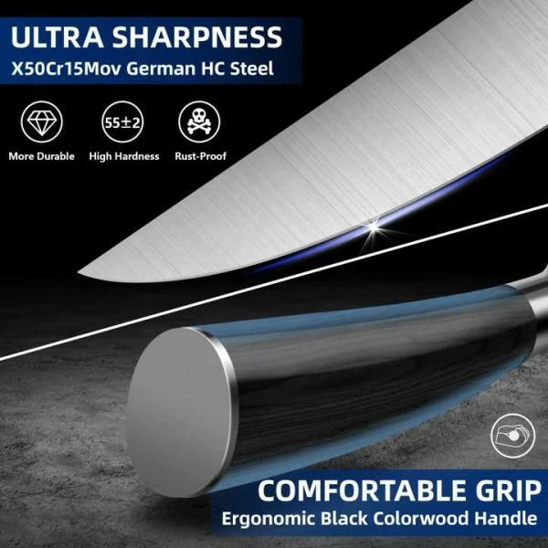 - Superb raw material- HOMLUX chef’s knife is made of German high carbon forged stainless steel (X50Cr15), from vacuum heating treatment, nitrogen cryogenic tempering to hand honing, each chef’s knife goes through at least 50-steps to gain strength, and is engineered to perfection at 55±2 Rockwell hardness, it’s hand polished to a satin finish, the knife blade is painstakingly hand sharpened to 12° per side, maintaining the perfect balance between ultra-thin slicing and maximum tenacity for smooth cutting