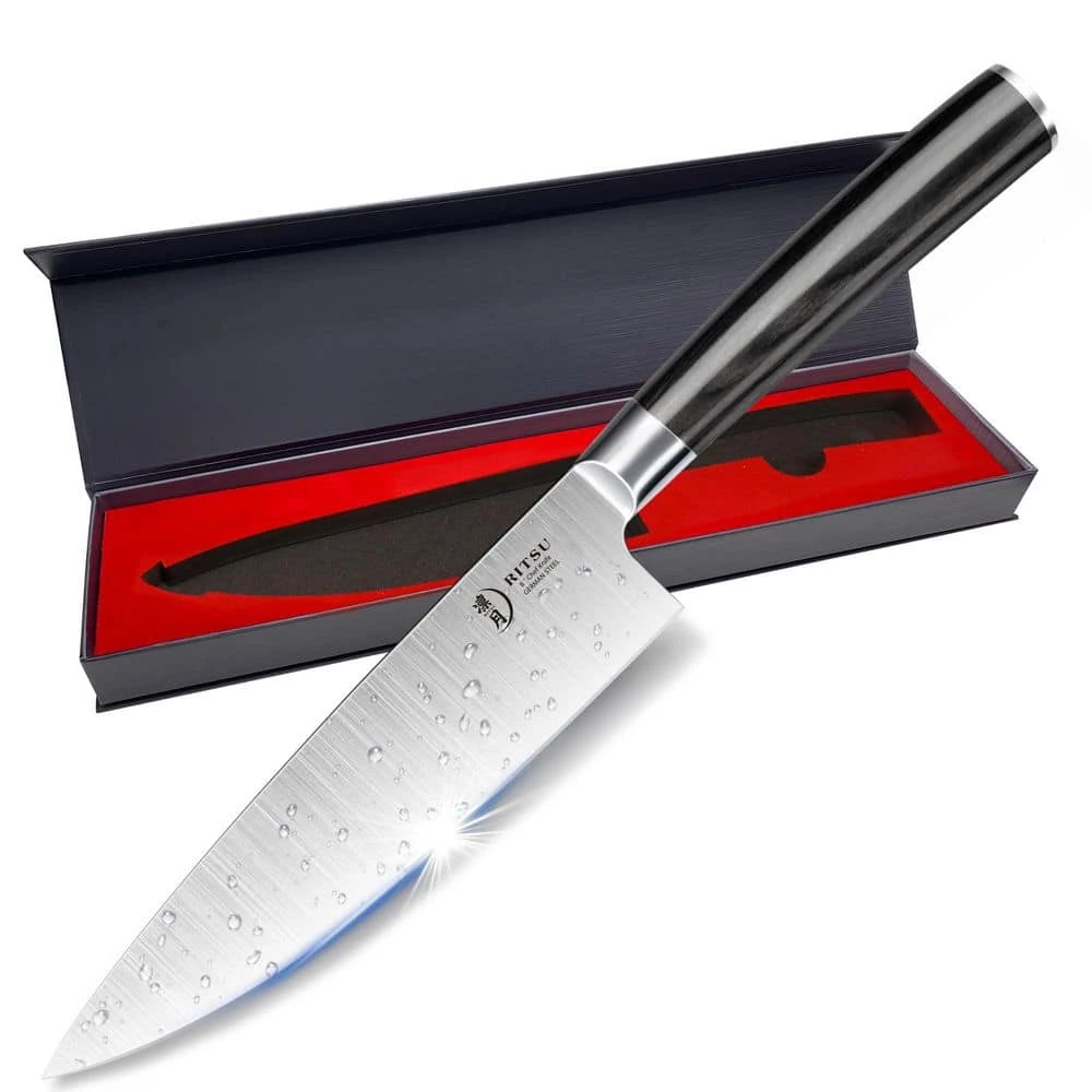- Ergonomically G10 handle-the blade of this chef’s knife is integrated with a 5.3 in. length solid G10 handle, which is constructed from military-grade fiberglass, the ergonomic shape enables the right balance between the handle and the thin blade, help minimize tension at the wrist and provides a solid grip, easy handling even when wet makes each cutting knife safer and more efficient