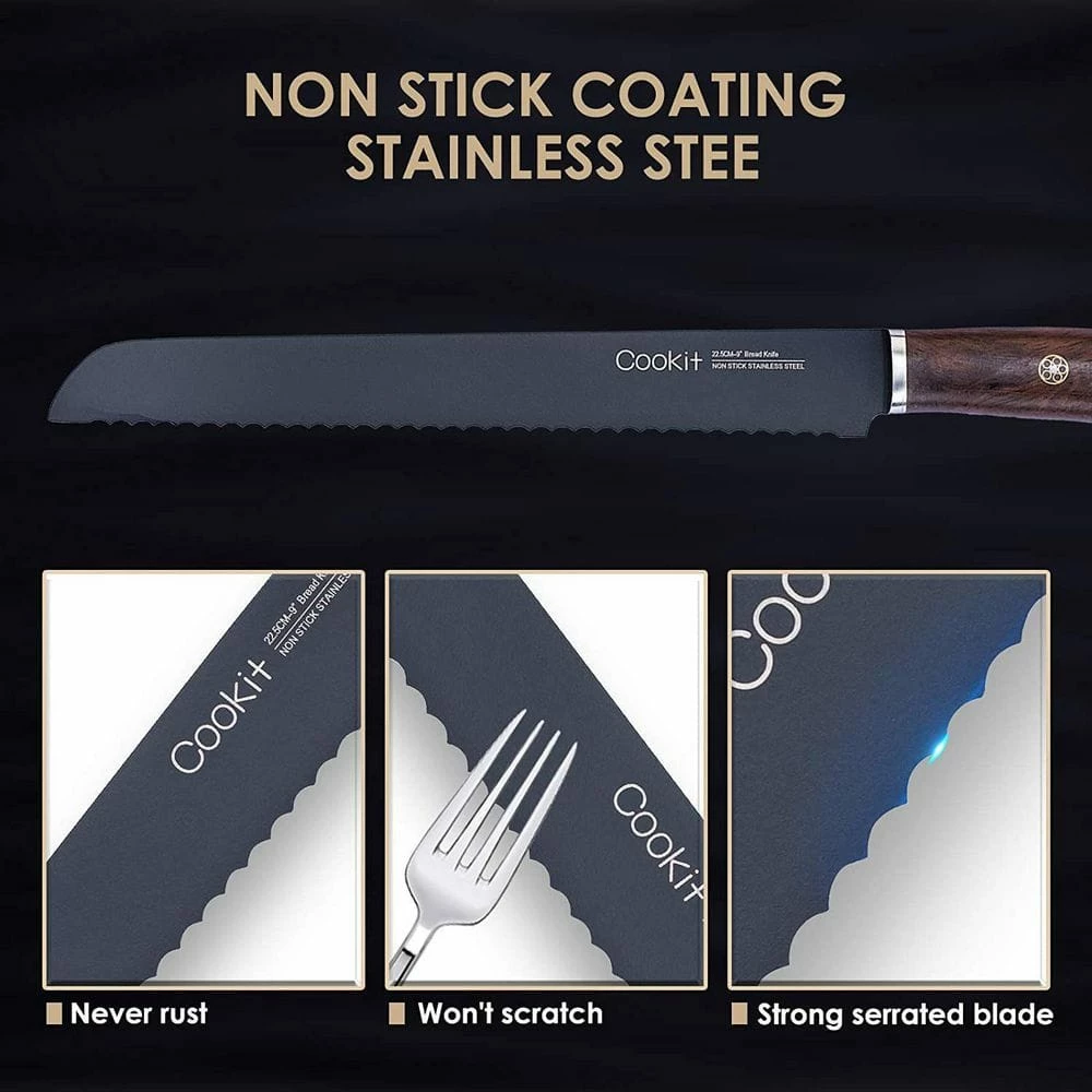 - Cookit Bread Knives with serrated edges are non-stick coated stainless steel tableware that protects against rust, corrosion and discoloration
