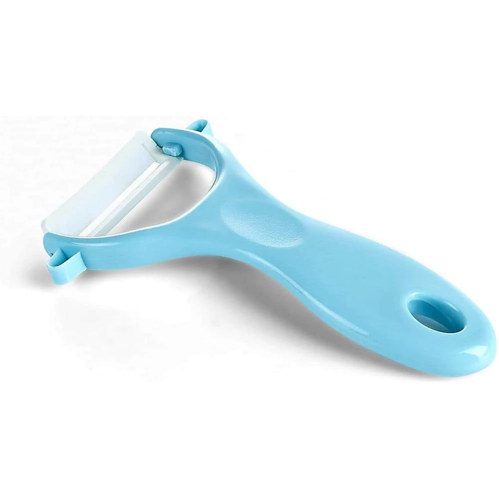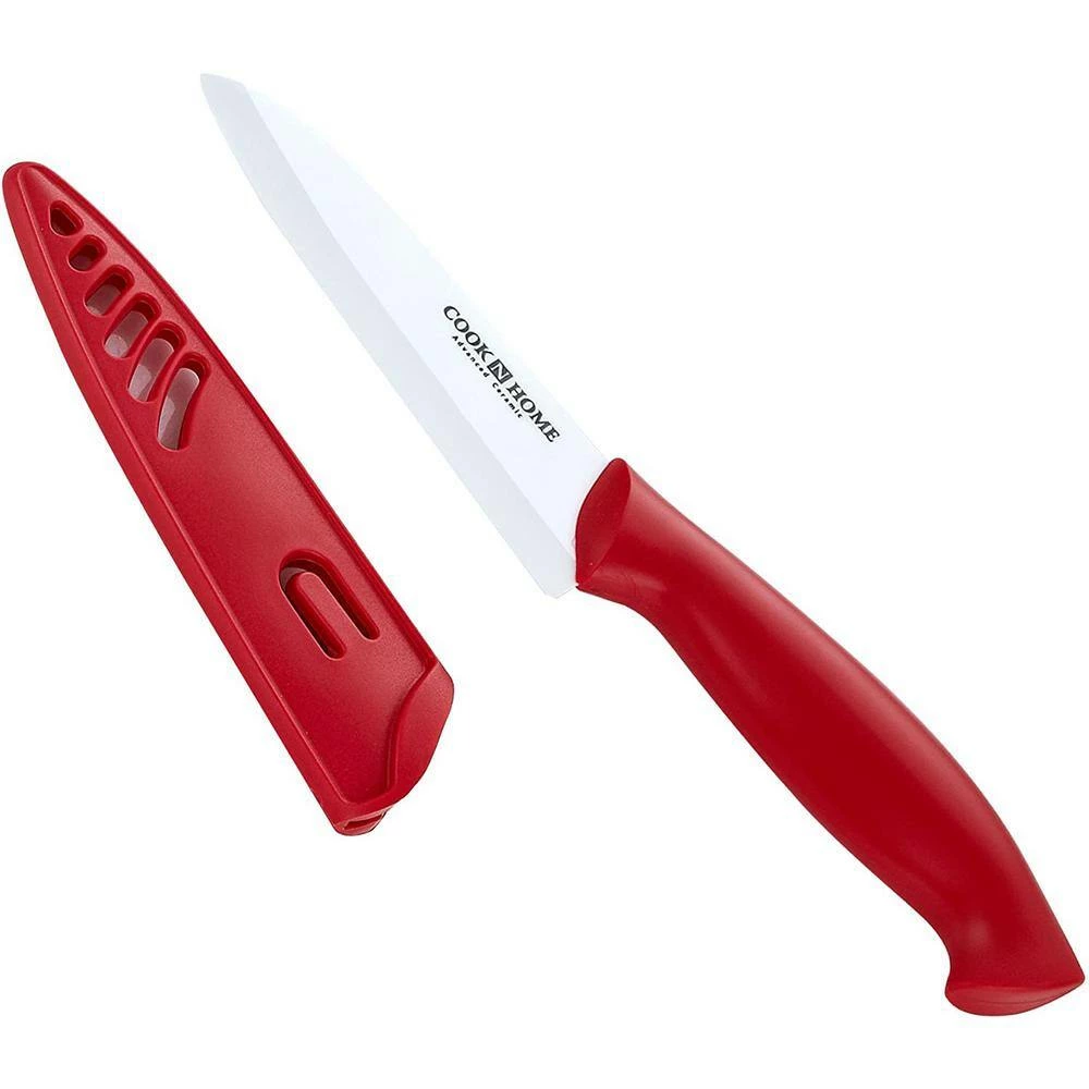 The Cook N Home 9-Piece Ceramic Knife Set with Sheaths, Multicolor includes: 6-inch santoku chef’s, 5 in. utility, 4 in. fruit, 3 in. paring knives with sheaths, and a peeler. Knives are sharp, rarely need sharpening, and harder than regular steel. No metallic taste when cutting delicate vegetables and fruits. Non-reactive with food and keeps foods’ original taste and color. Knives are easy to clean, balanced, hygienic, and look great. Multipurpose for slicing boneless meats, fruits, vegetables, etc. Not dishwasher safe, hand wash recommended.