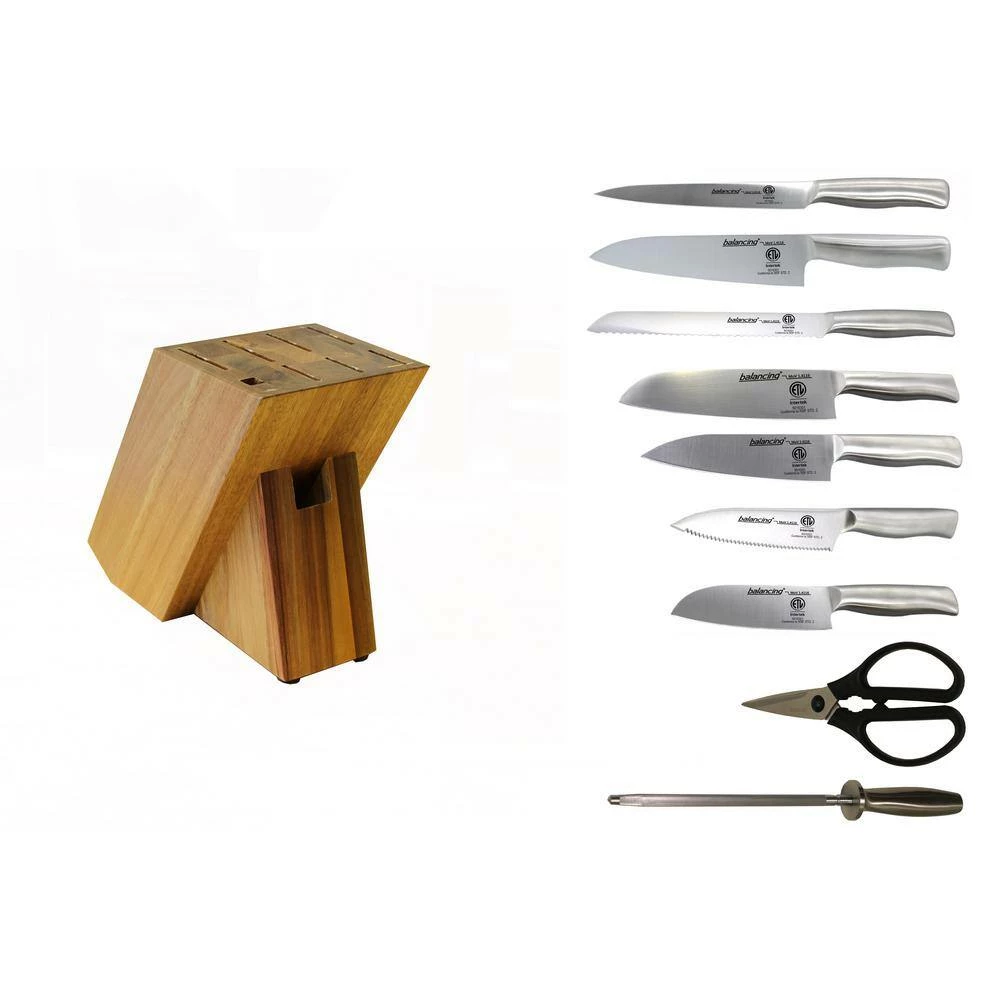 - 10-piece set includes, 1-forged 5 in. utility knife, 1-forged 5 in. santoku, 1-forged 6 in. chef’s knife, 1-forged 7 in. santoku, 1-forged 8 in. bread knife, 1-forged 8 in. chef’s knife, 1-forged 8 in. slicer knife, 1-8 in. honing steel, 1-forged 8 in. shears, 1-acaica wood block