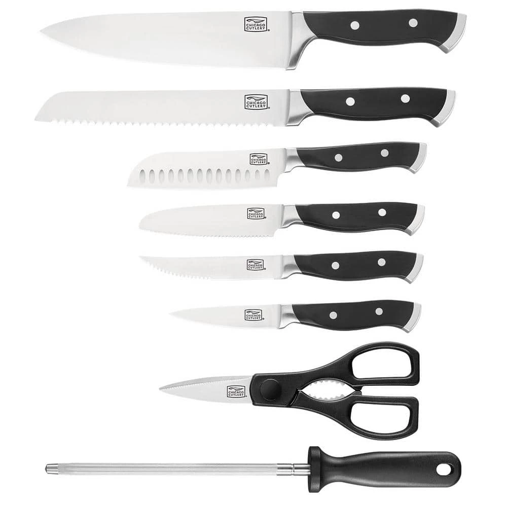 - Set includes: 8″ chef, 8″ serrated bread, 5″ partoku, 4.25″ utility, 3.5″ paring, (8) 4.5″ steak knives, 10″ sharpening steel, shears, wood block