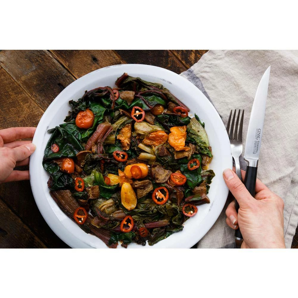 The Japanese word Chikara means power and energy and the Chikara Signature Series, 4-Piece Steak Knife Set boldly embodies both power and energy. Forged from Japanese stainless steel that is known worldwide for its stain and rust resistance, as well as its strength and ability to hold an incredibly sharp edge. The 4-Piece Chikara Steak Knife Set allows you to easily and effortlessly slice through prepared meats. The traditional style handles are made of heat and water resistant resin that fits smoothly and comfortably into your hand. With Japanese steel tang extending through the entire handle to provide you with maximum balance and control, precision cutting has never been easier and faster. This steak knife set is a shining example of the quality craftsmanship that Ginsu is so well known and respected for. To further protect your cutlery and ensure top performance both now and-years to come, this product is offered with a limited lifetime warranty.