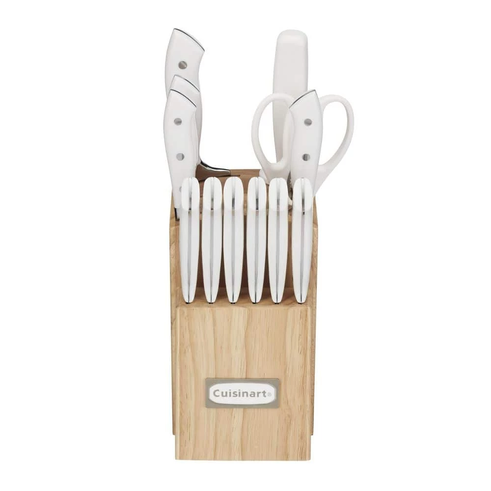 Complete comfort and control meet ultra-sharp cutting performance in this distinctively designed cutlery set. Full-tang ground blades are forged with high-carbon stainless steel for smooth, balanced handling and are tapered to supremely fine edges for effortless slicing. Extra-wide safety bolsters and riveted ergonomic handles provide perfect stability. Angled countertop block displays the knives with an on-trend touch.