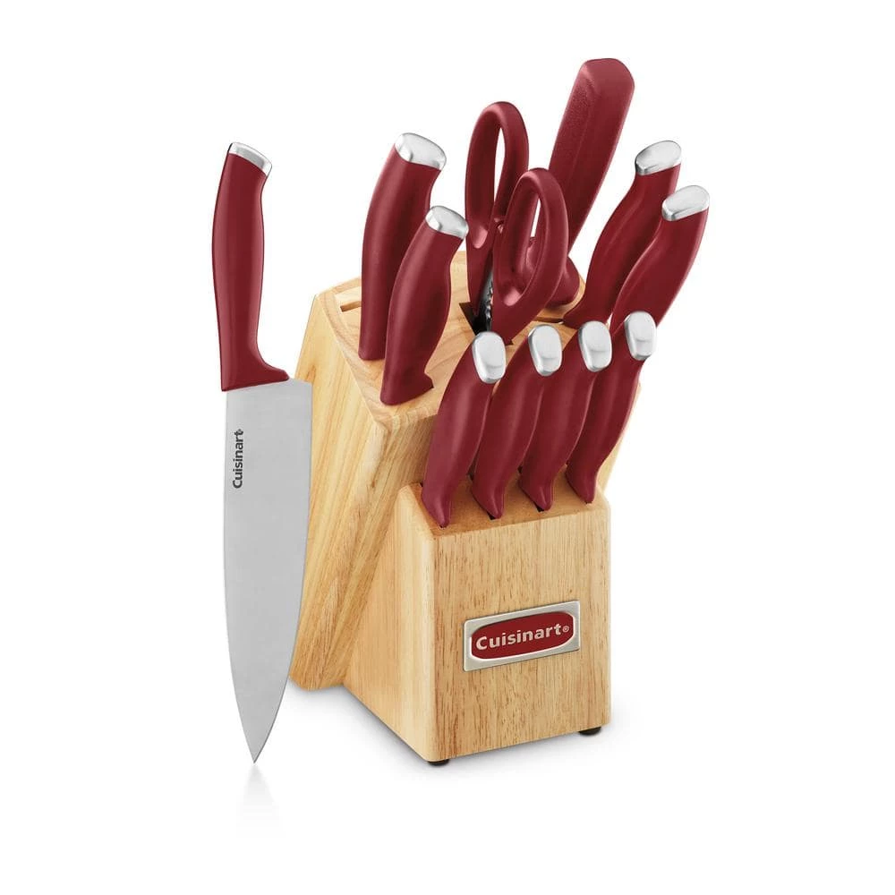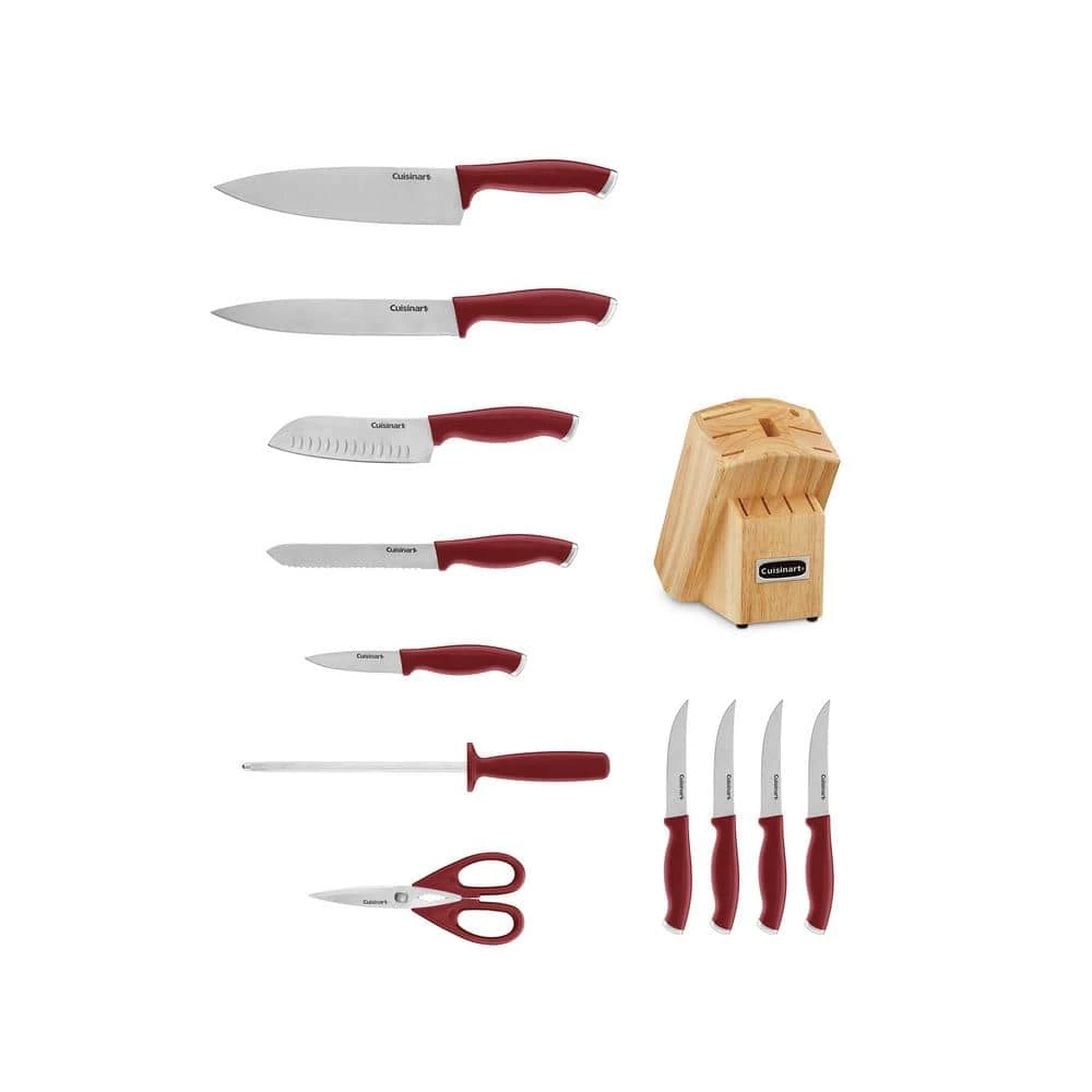 This 12-Piece, Color Pro Collection adds innovative lines, looks, and textures to this Beautiful Red handled cutlery block set. New blade surfaces, unique textured handles, and a selection of both knife styles and block styles let consumers choose superior cutting tools that fit their kitchen decor as well as their personal cooking styles. Quality and design in one set.