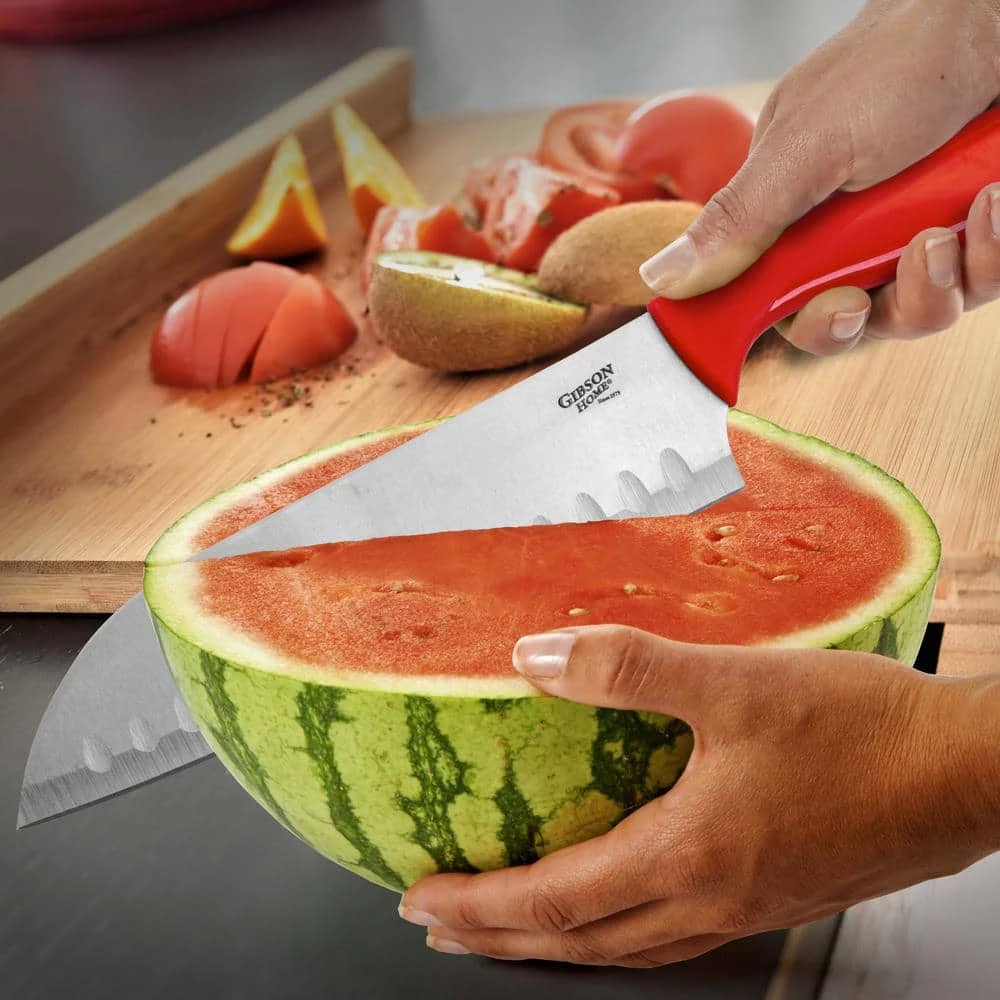 Make sure all your slicing and dicing needs are met with the comprehensive Gibson Home Color Vibes 14 Piece Cutlery Set. Each knife of this beautiful collection boasts precision and durability. Stainless Steel constructed blades are nice and sharp for all your food preparation needs. All your new kitchen tools can be beautifully displayed on the counter top in the handy storage block to show off the eye-catching colorful handles.