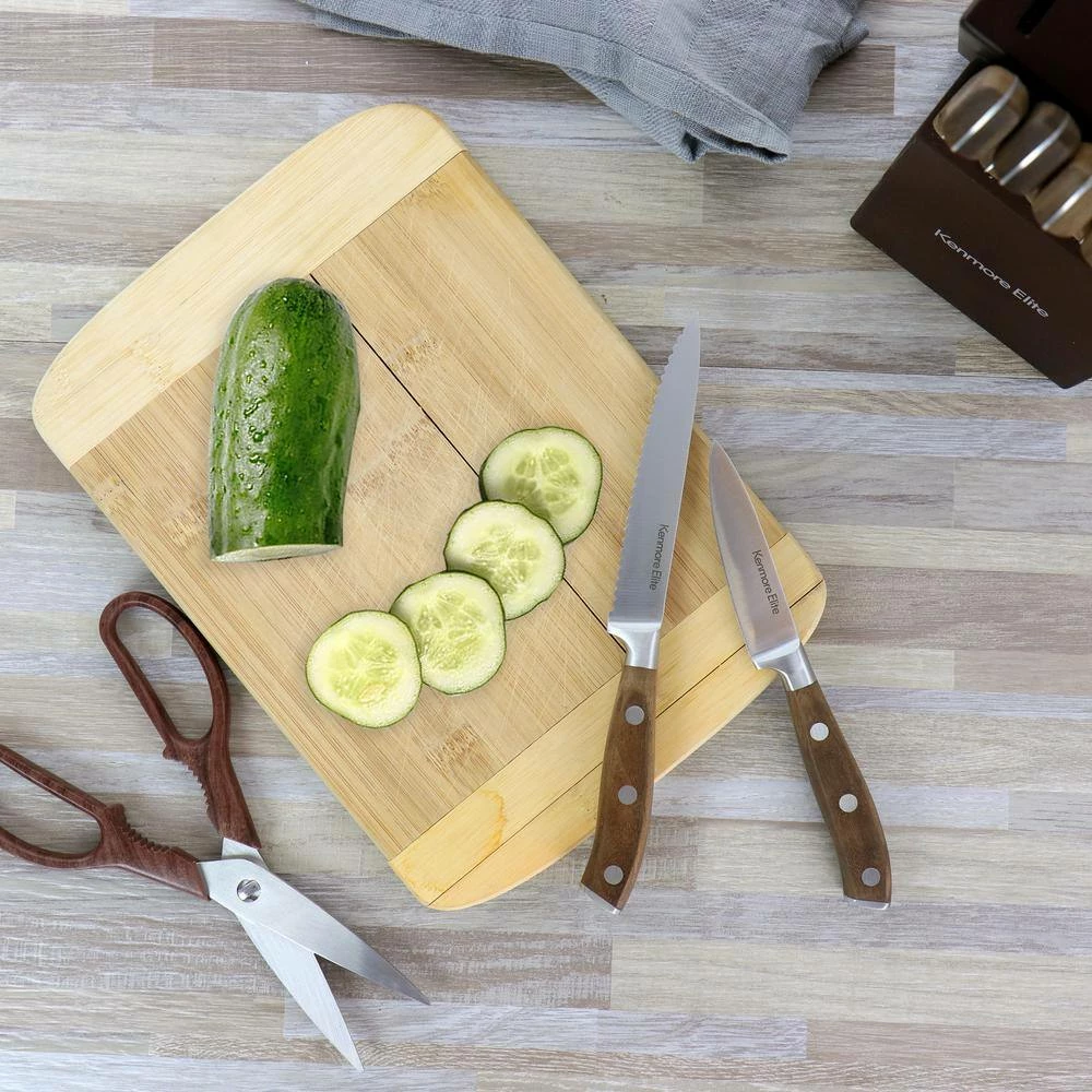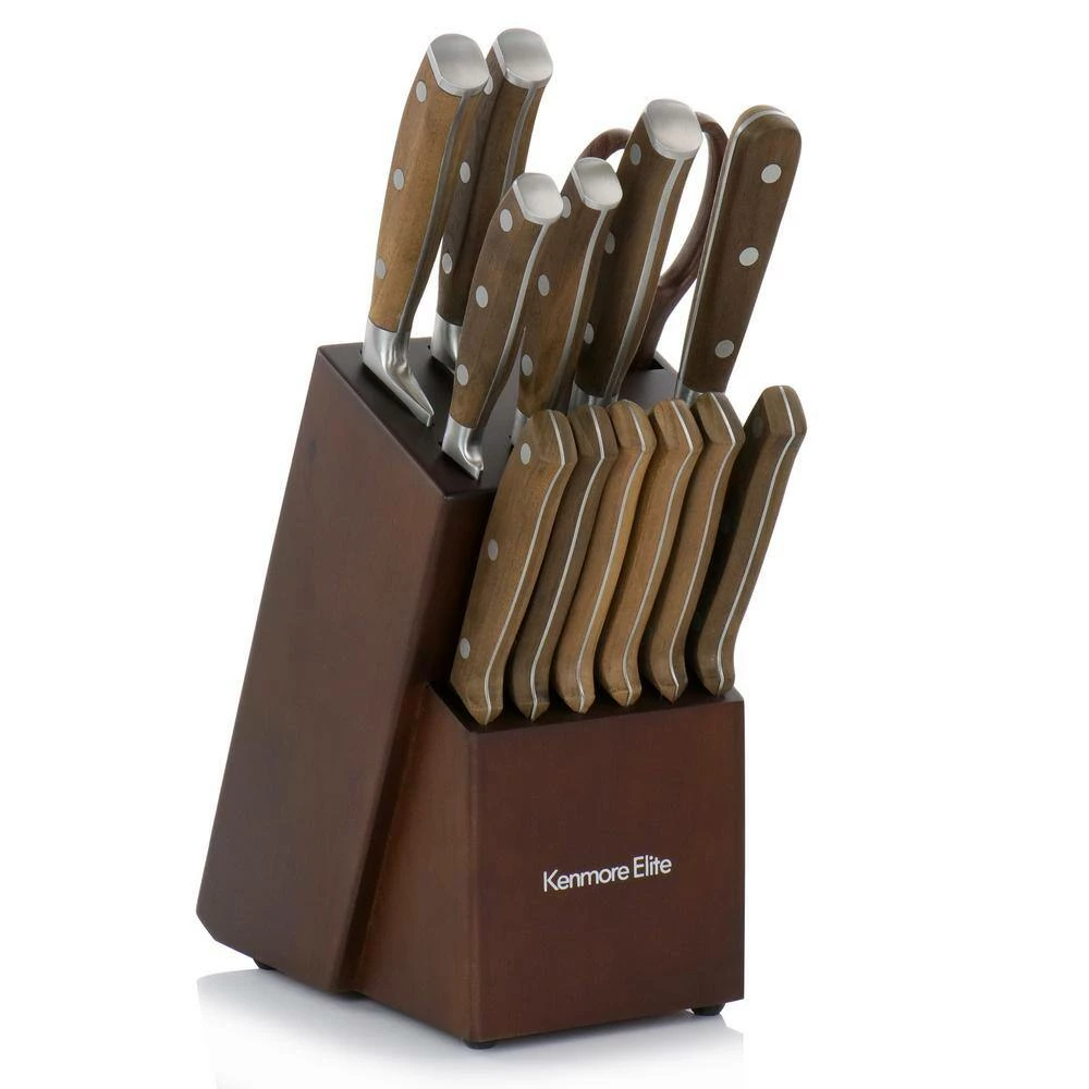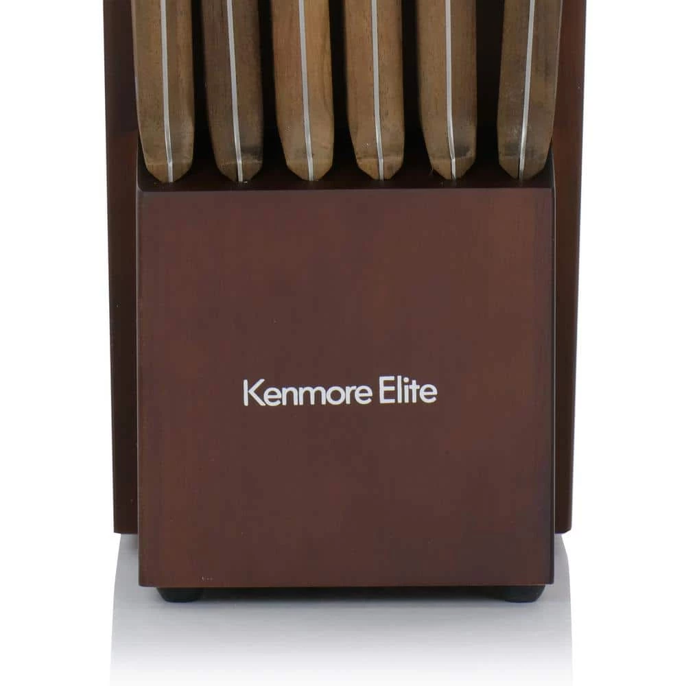 The Kenmore Elite Cooke 14 Piece Stainless Steel Cutlery Set in Dark Brown provides the perfect aide in creating ideal dinners. Each piece is fashioned with a dark wood handle, along with a dark brown rubberwood block that elevates any kitchen’s visual appeal. The high carbon stainless steel blades can easily cut through most ingredients with ease. Slice chicken, dice onions, and chop fresh herbs with little effort to make your dream dishes!
