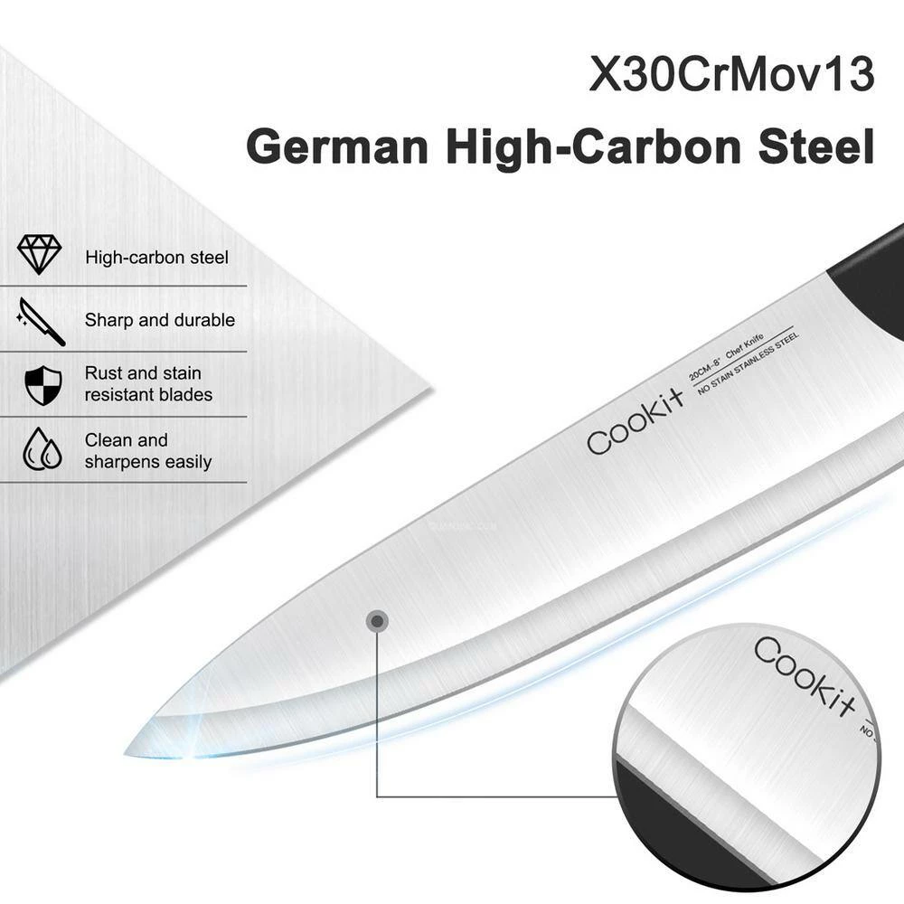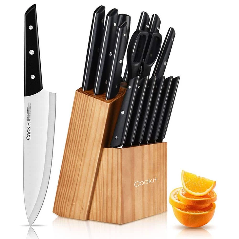 - Cookit 15-piece professional knives set includes: 8 in. chef knife, 8 in. bread knife, 8 in, slicing knife, 7 in, santoku knife, 5 in. utility knife, 3.5 in. paring knife,kitchen scissors, knife sharpener, 6-pieces of 5 in. steak knife and pine wooden block