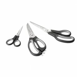 Get the size you want and need with 3 different scissor styles making it a perfect set for any kitchen. Features ergonomically designed handles for safe handling. Large- 9.75 in. x 3.25 in., Medium- 8.75 in. x 3 in., Small- 5.5 in. x 2.5 in.